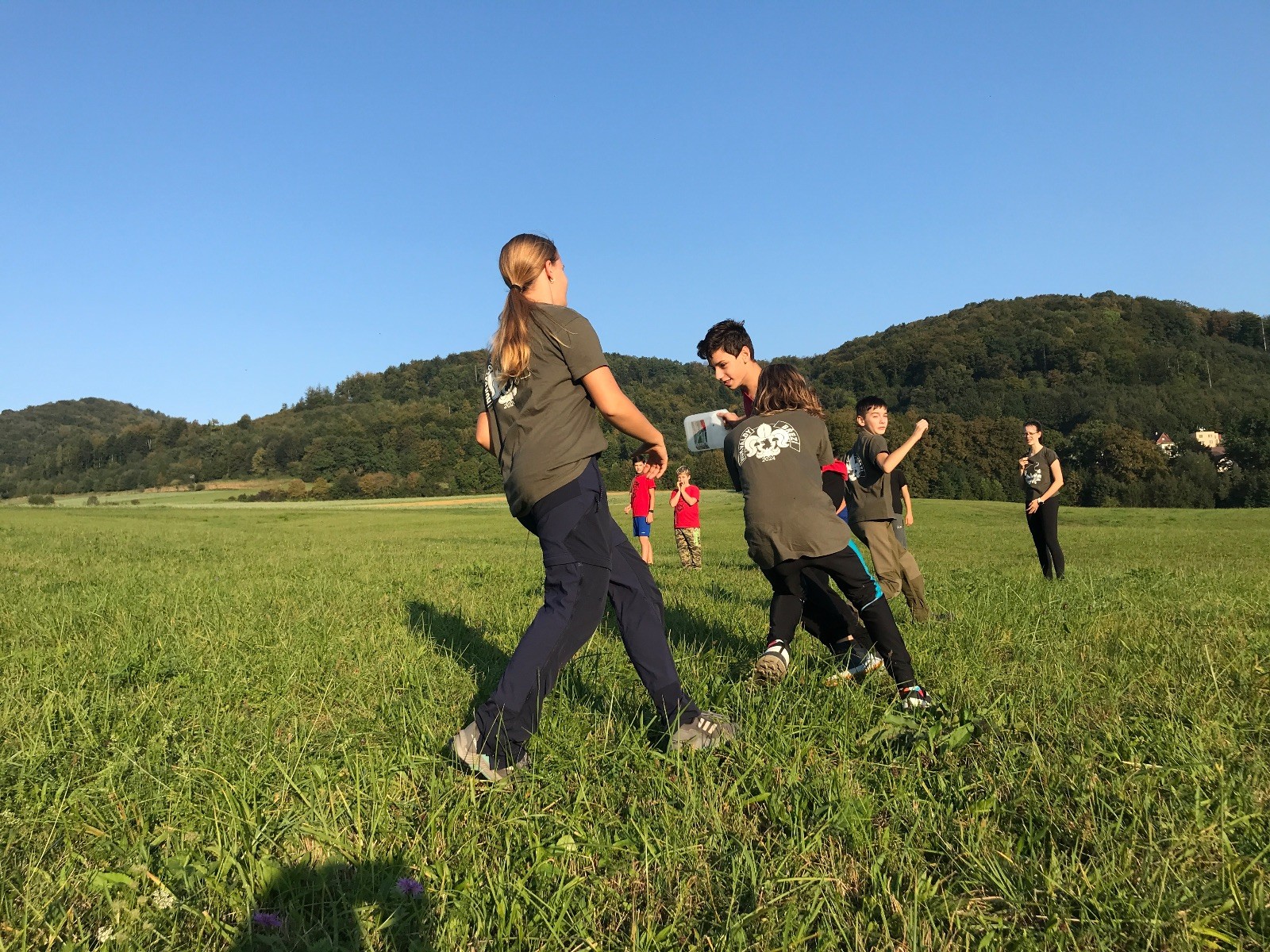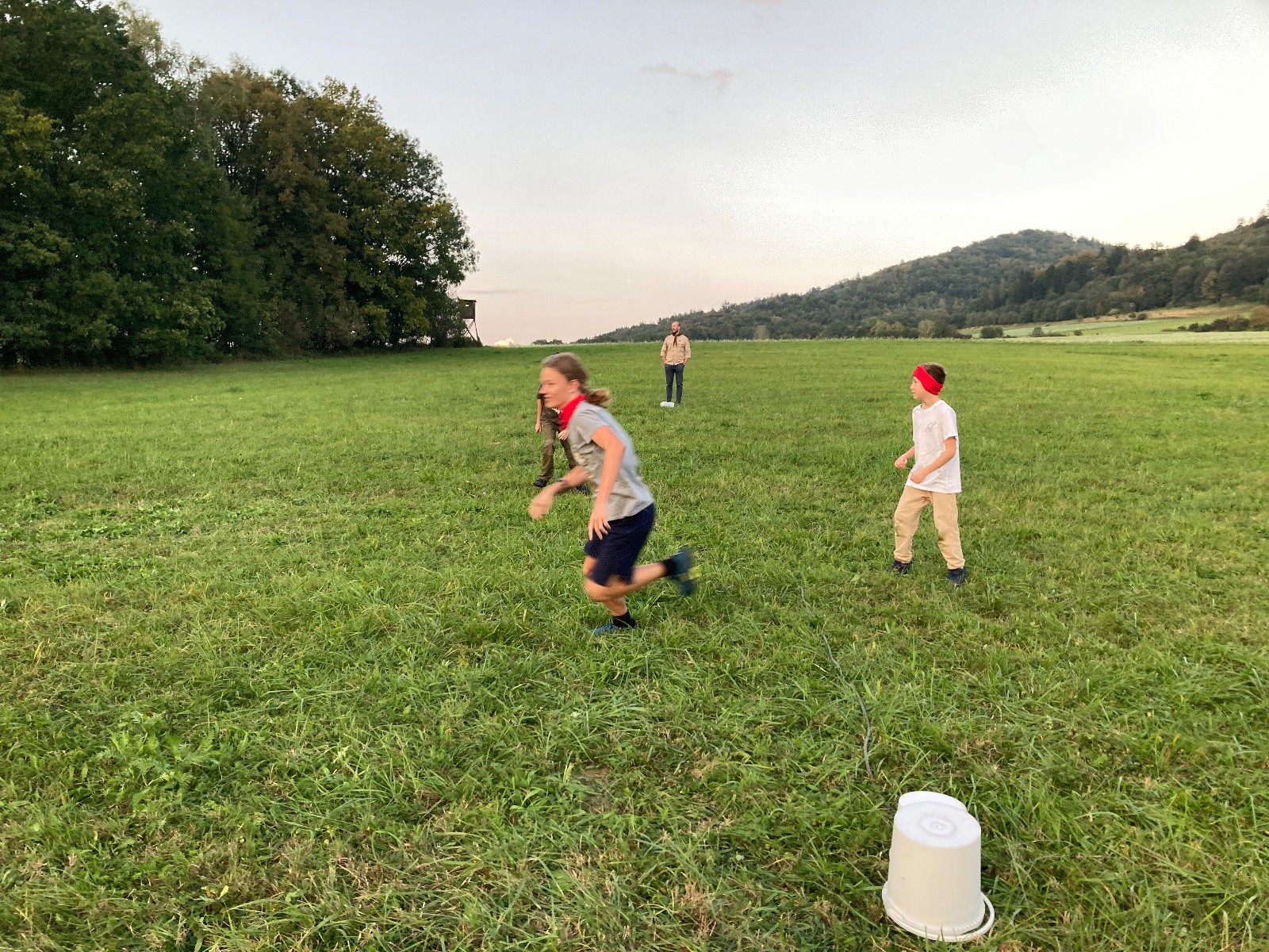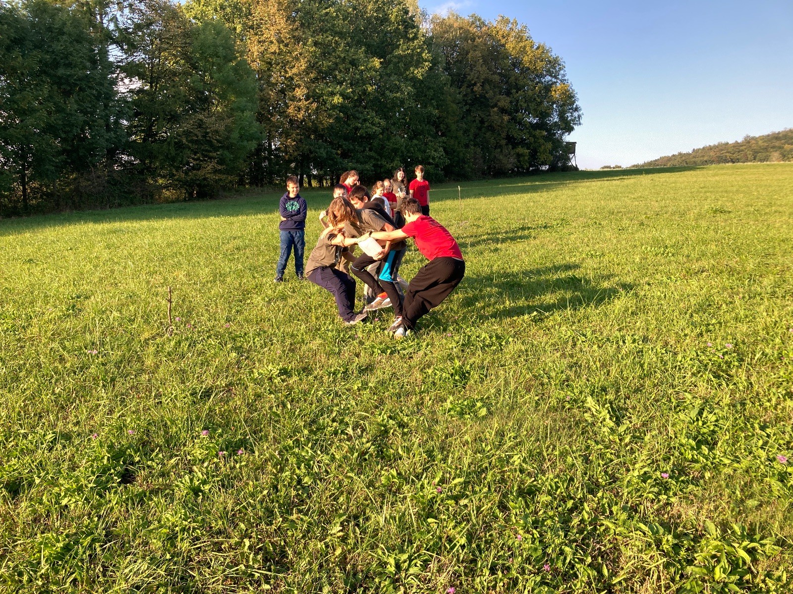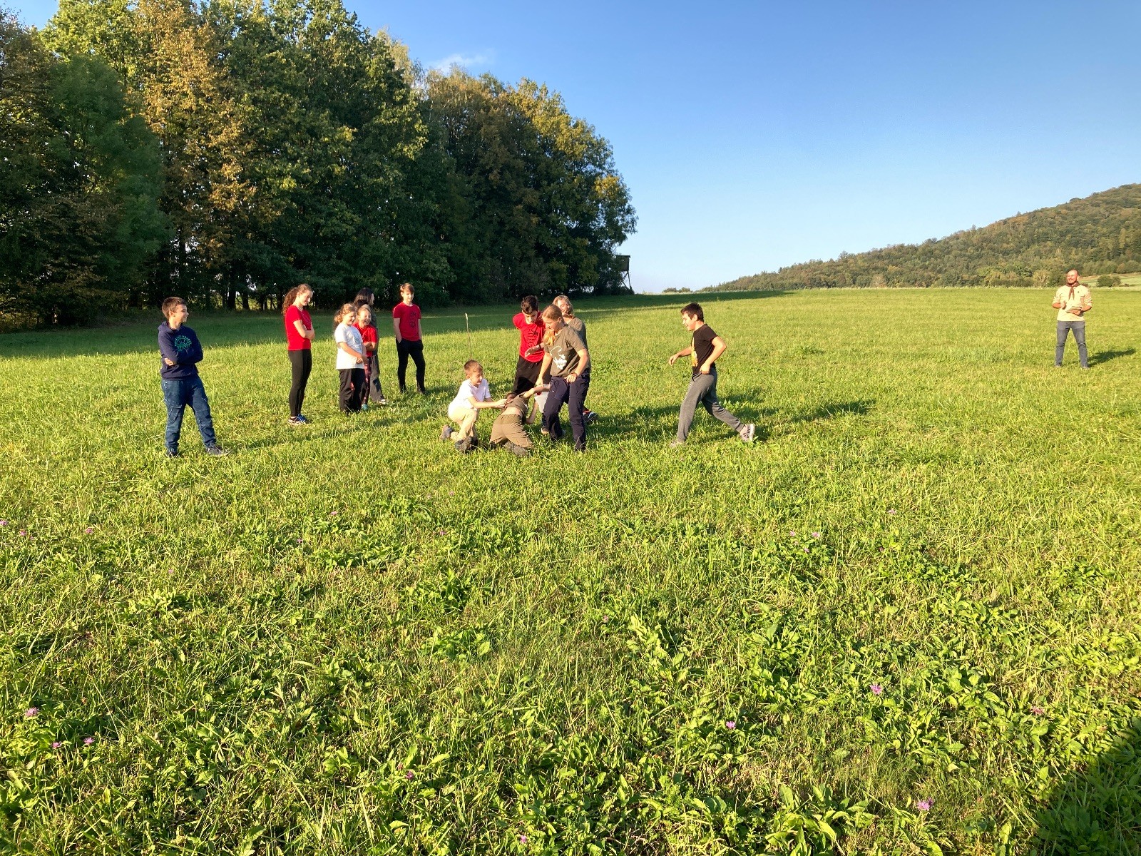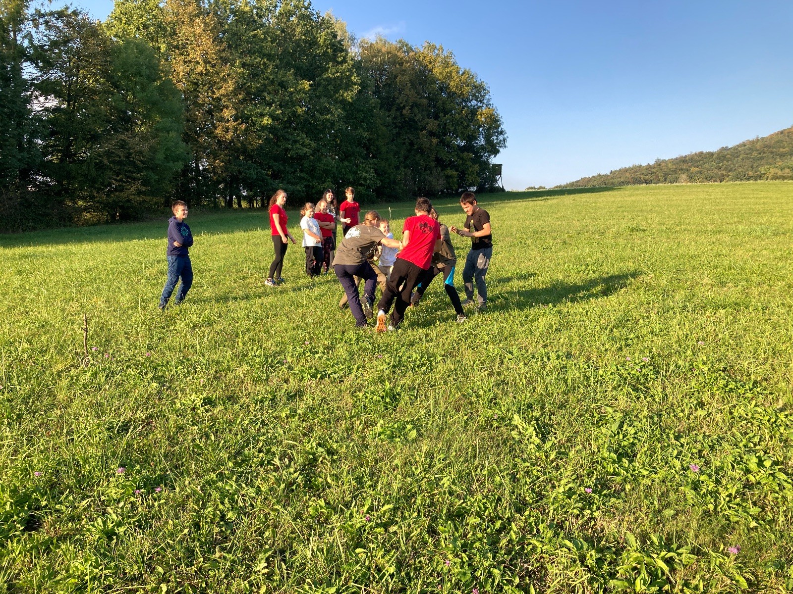 Startli jsme klasicky vyvěšením vlajky, nechali vzkaz pro opozdilce a vydali se na louku. Tam jsme si já a Páťa rozdělily týmy a podle kanystru, který byl položen doprostřed louky, jsme poznali, co nás čeká. Klepeto upřesnil, že se jedná o “plnotučný” kanystr, ale všichni staří pardáli podle pravidel pochopili, že to je úplně obyčejný hardcore. A ten mají Lišky opravdu v oblibě. Takže jsme se do toho s radostí vrhli. Začali jsme s čísly a pak přešli na verzi “vyběhne každý kdo…”. V průběhu se k nám připojili i Valča, Ondra a Janča. Zahráli jsme několik kol a v každém jsme o kanystr bojovali jako o život. Takže následný družiňák na odpočnutí celkem bodnul.