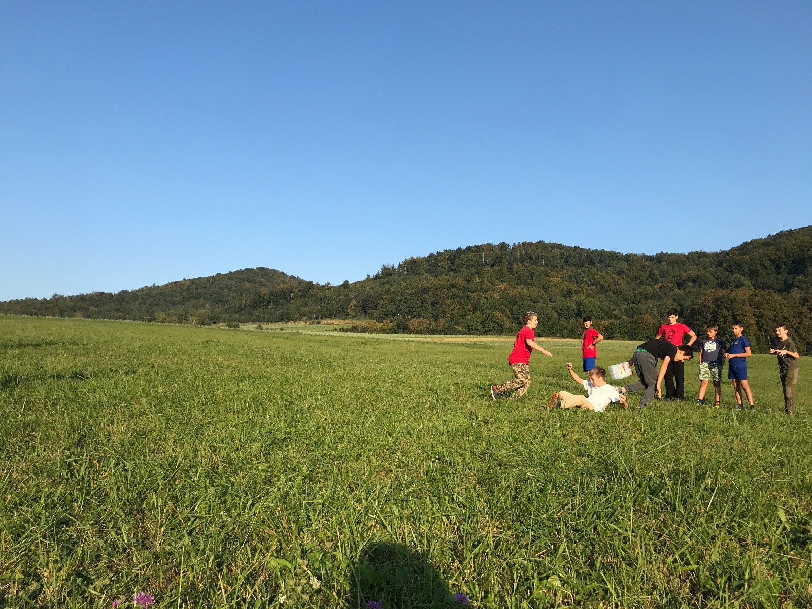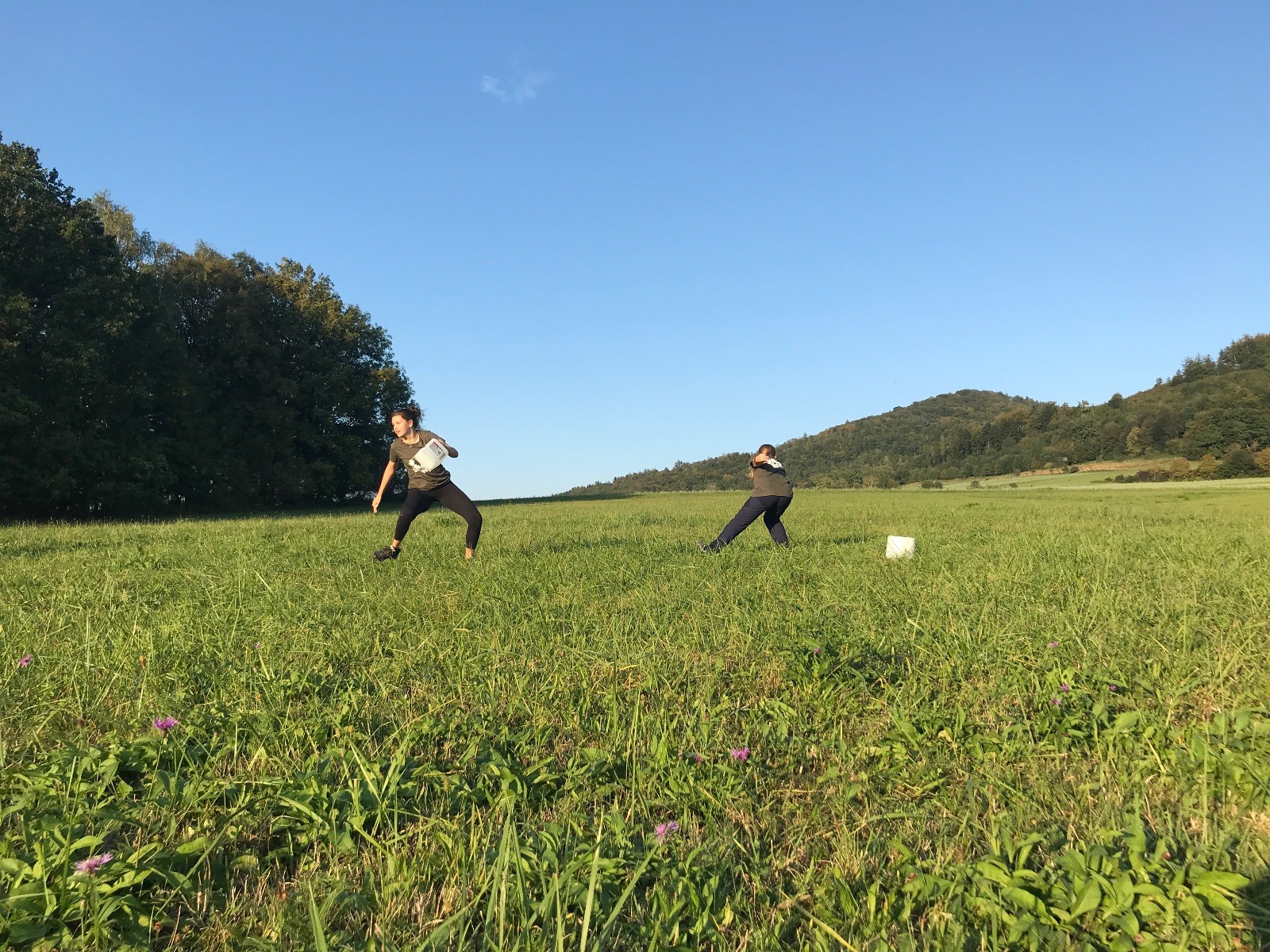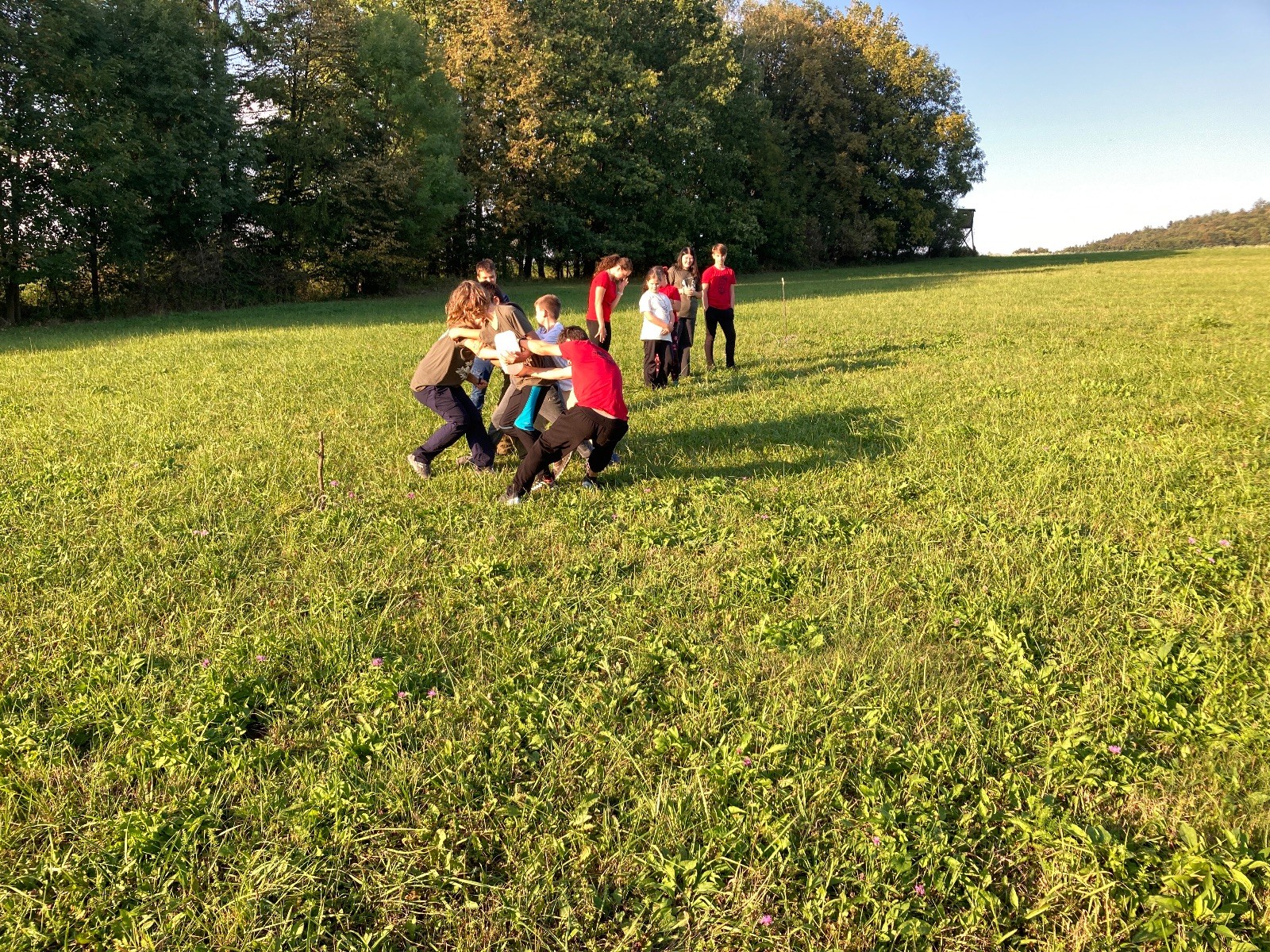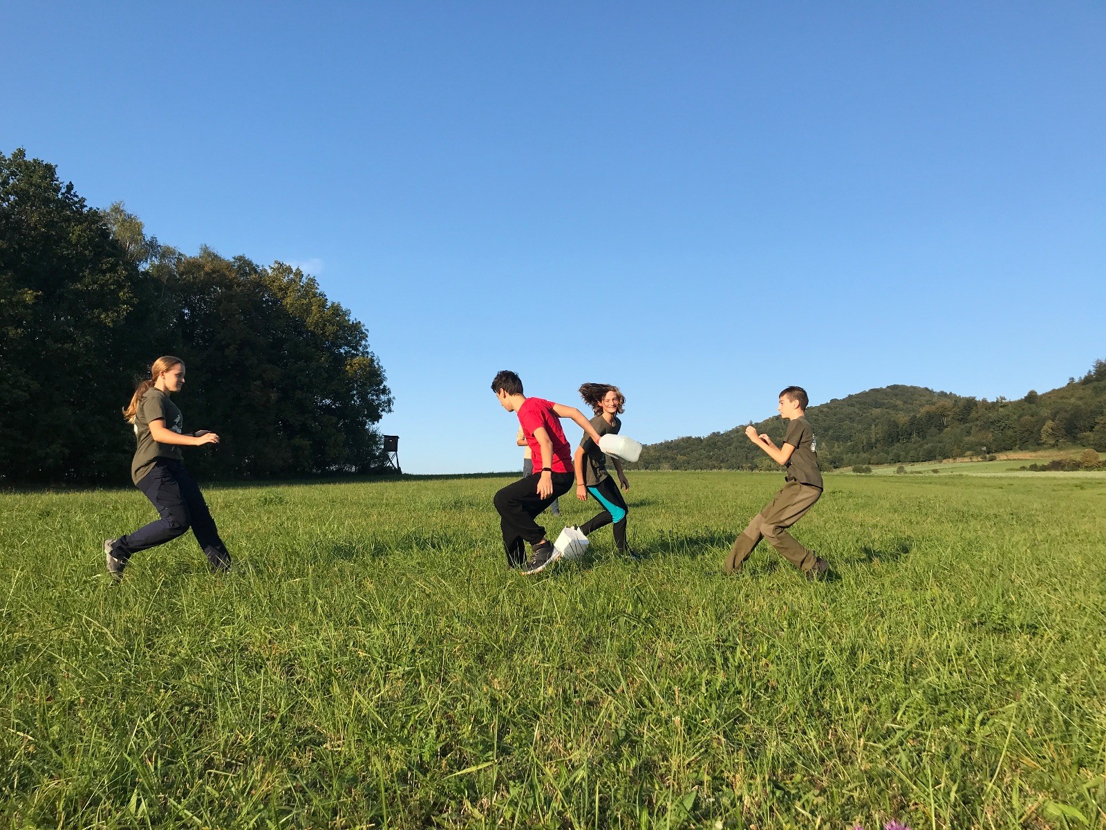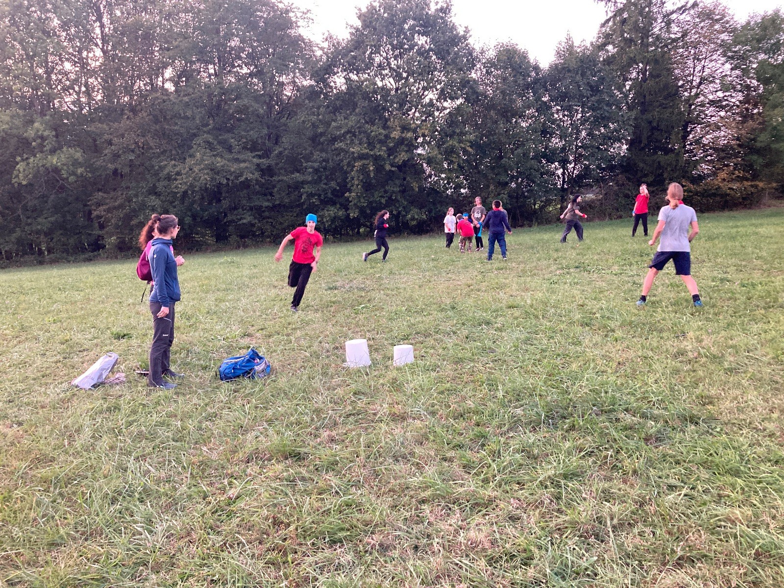 Startli jsme klasicky vyvěšením vlajky, nechali vzkaz pro opozdilce a vydali se na louku. Tam jsme si já a Páťa rozdělily týmy a podle kanystru, který byl položen doprostřed louky, jsme poznali, co nás čeká. Klepeto upřesnil, že se jedná o “plnotučný” kanystr, ale všichni staří pardáli podle pravidel pochopili, že to je úplně obyčejný hardcore. A ten mají Lišky opravdu v oblibě. Takže jsme se do toho s radostí vrhli. Začali jsme s čísly a pak přešli na verzi “vyběhne každý kdo…”. V průběhu se k nám připojili i Valča, Ondra a Janča. Zahráli jsme několik kol a v každém jsme o kanystr bojovali jako o život. Takže následný družiňák na odpočnutí celkem bodnul.