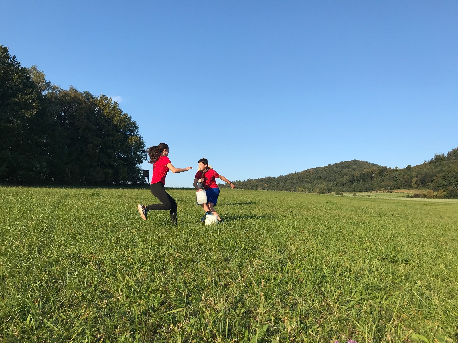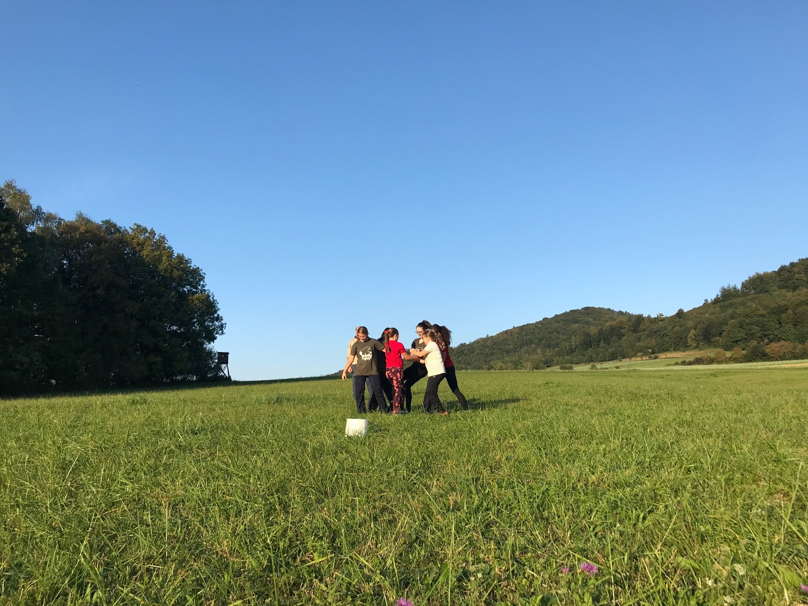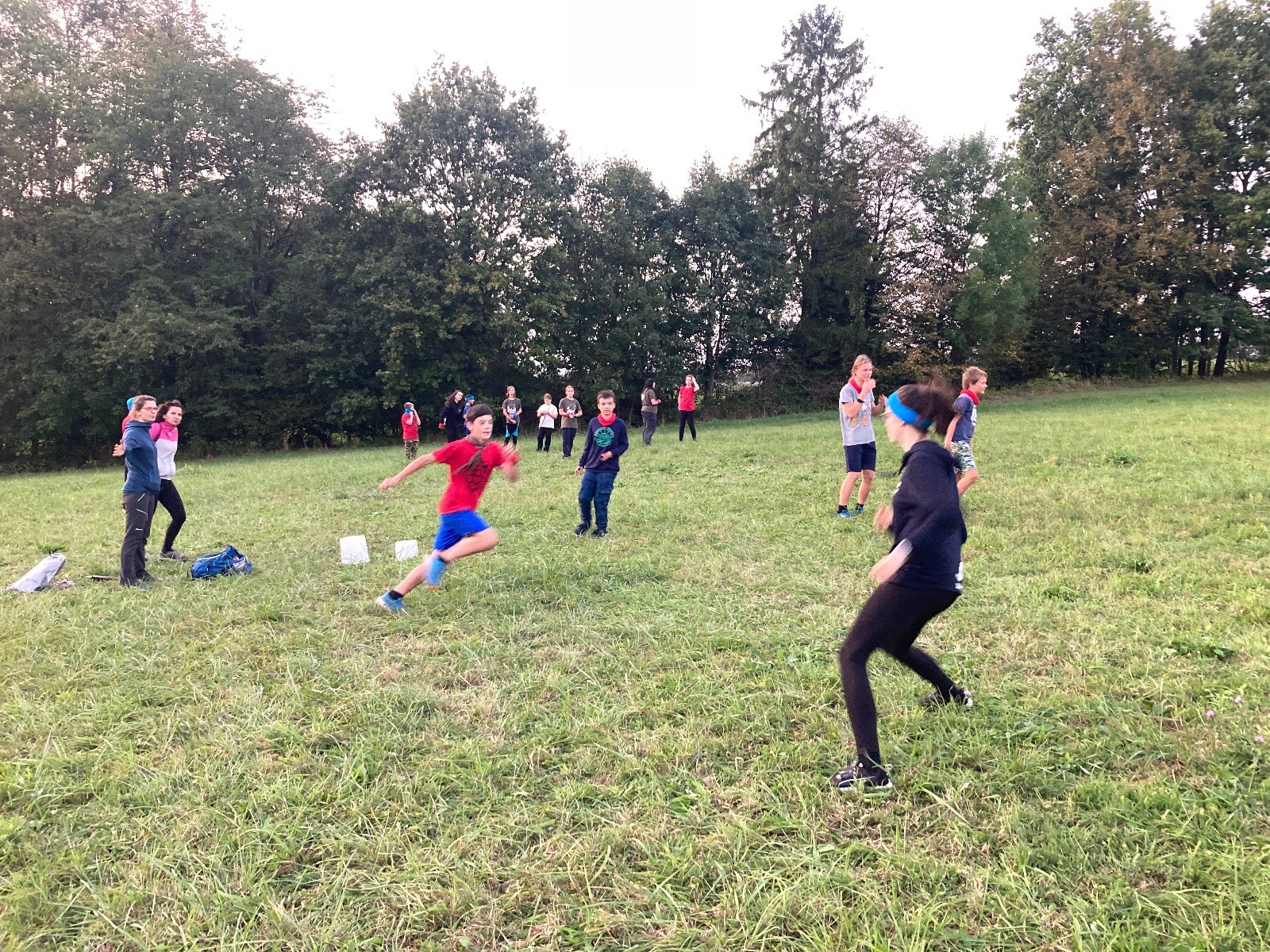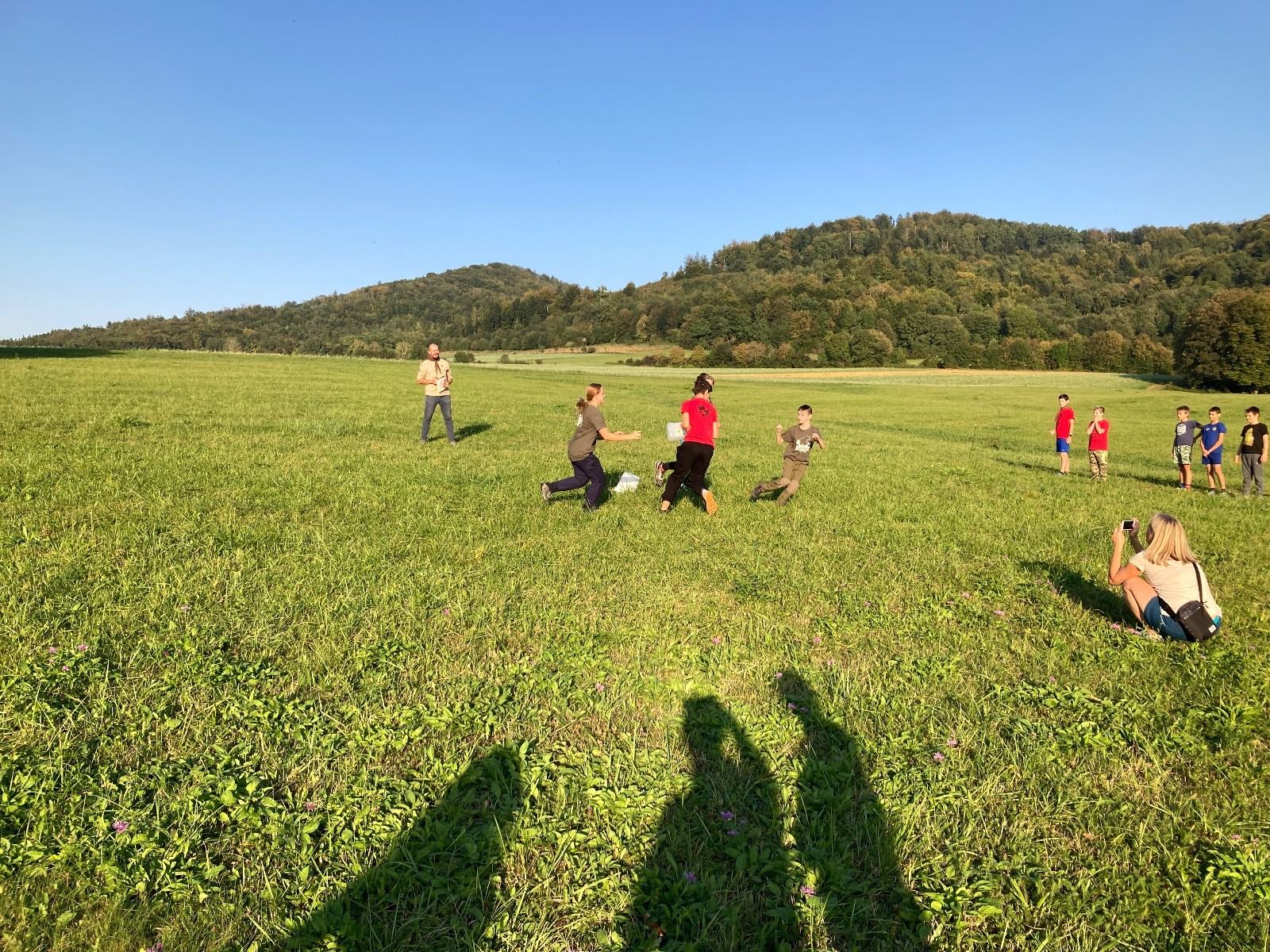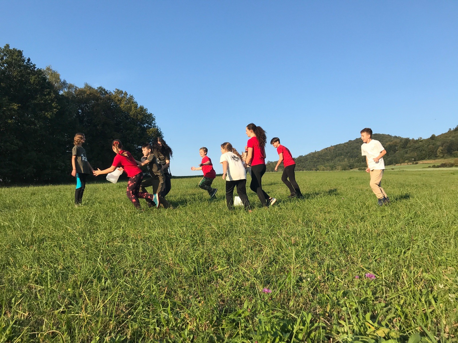 Startli jsme klasicky vyvěšením vlajky, nechali vzkaz pro opozdilce a vydali se na louku. Tam jsme si já a Páťa rozdělily týmy a podle kanystru, který byl položen doprostřed louky, jsme poznali, co nás čeká. Klepeto upřesnil, že se jedná o “plnotučný” kanystr, ale všichni staří pardáli podle pravidel pochopili, že to je úplně obyčejný hardcore. A ten mají Lišky opravdu v oblibě. Takže jsme se do toho s radostí vrhli. Začali jsme s čísly a pak přešli na verzi “vyběhne každý kdo…”. V průběhu se k nám připojili i Valča, Ondra a Janča. Zahráli jsme několik kol a v každém jsme o kanystr bojovali jako o život. Takže následný družiňák na odpočnutí celkem bodnul.