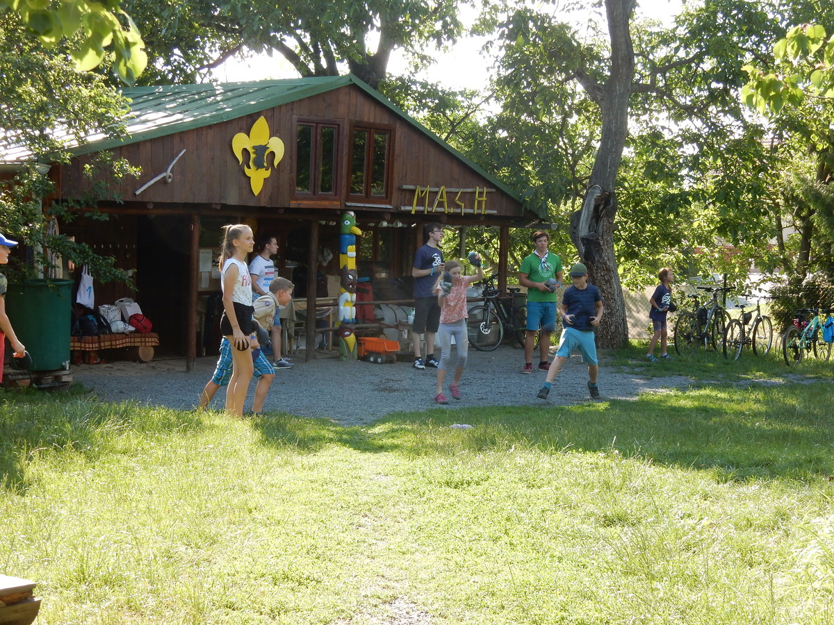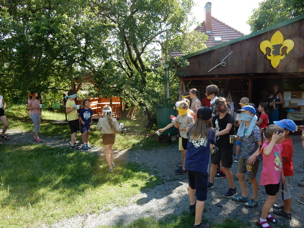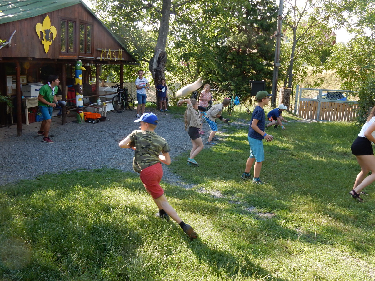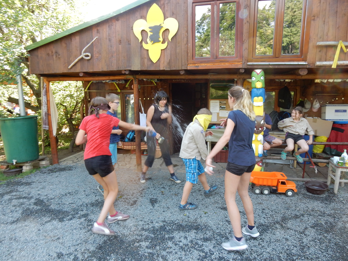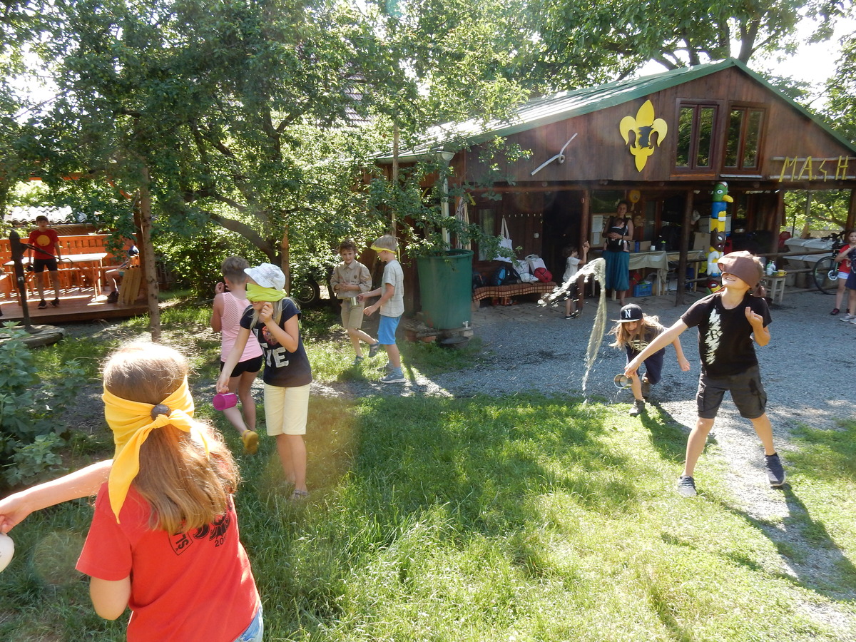 Je pátek 21.6.2019, 15:45, první letní den. Teploty atakují 30°C, svítí sluníčko a na Boudě se začínají scházet první členové oddílu. Sešlo se 48 dětí a 17 vedoucích.Po nástupu se děcka rozdělily na 2 poloviny a vysvětlily se pravidla hry Letadlo v mlze. Jde o hru, kde se v každém týmu děti rozdělí do dvojic, střelec se zavázanýma očima a navigátor. Po rozeznění píšťalky letí letadla do boje… Voda lítala vzduchem jako upřené pohledy střelců. Po dohrání se všichni sešli na špalcích a začalo vyhodnocování bodování a účasti. Jmen bylo řečeno během 10 minut opravdu hodně… Děti odcházely s odměnami jako jsou třeba plyšáci, čelovky, hrníčky, atd. Následovalo vyhodnocení otázek ze soutěže Vyznáte se?. Po vyhodnocení hned následovala tradiční bojovka s hadrovými koulemi. Stejné týmy, avšak s posilama z řad vedoucích. Bitva to byla neskutečná, koule lítaly vzduchem jedna za druhou. Zvednuté ruce a smutné odcházení na špalek… Po 3 kolech se rozhodlo vítězstvím 2:1 pro zelený. Teď už není moc o čem psát protože proběhl závěrečný nástup a šlo se domů. Tak se snad všichni zase brzo potkáme na táboře! Roxy