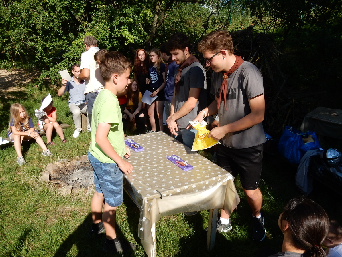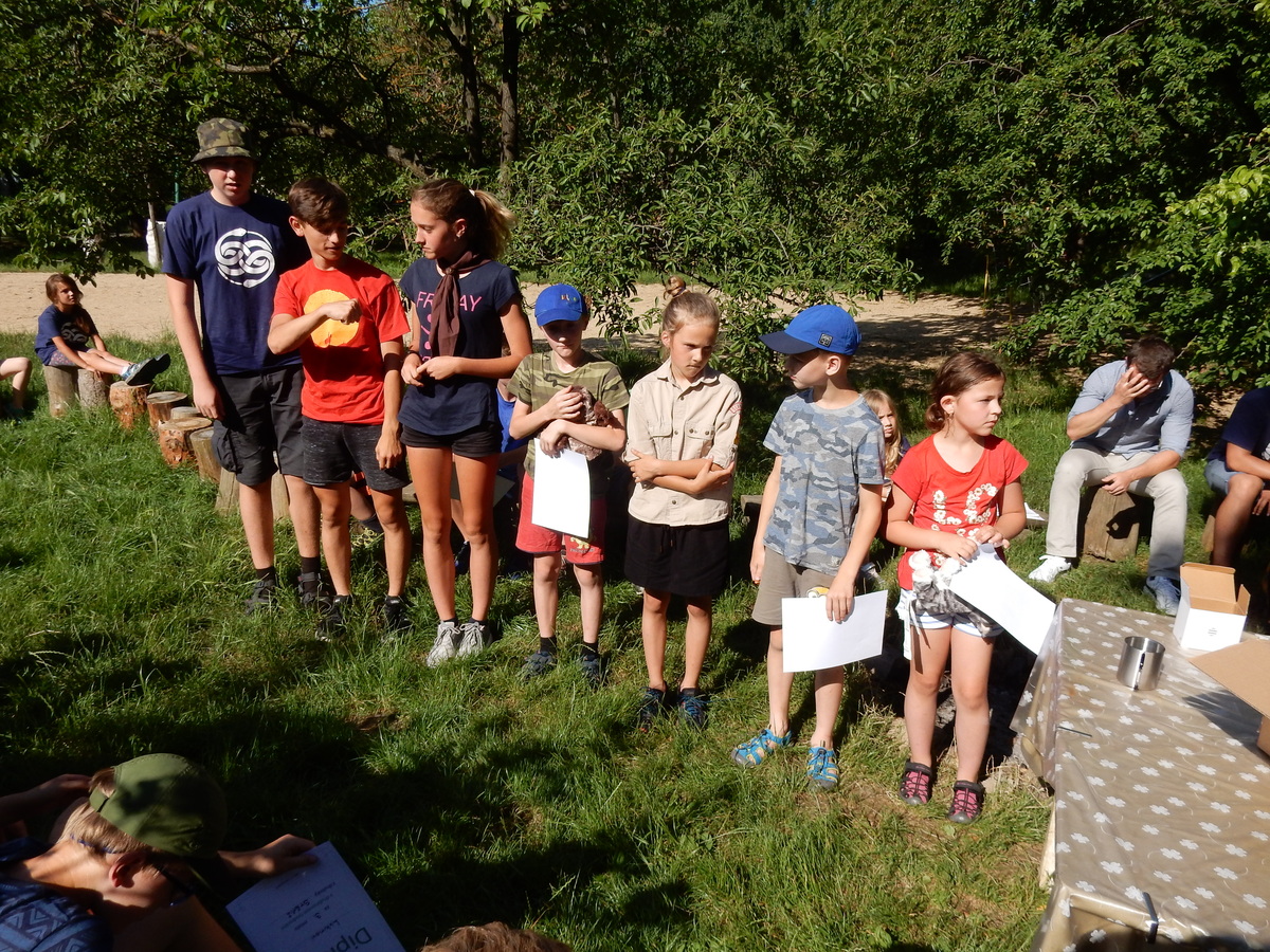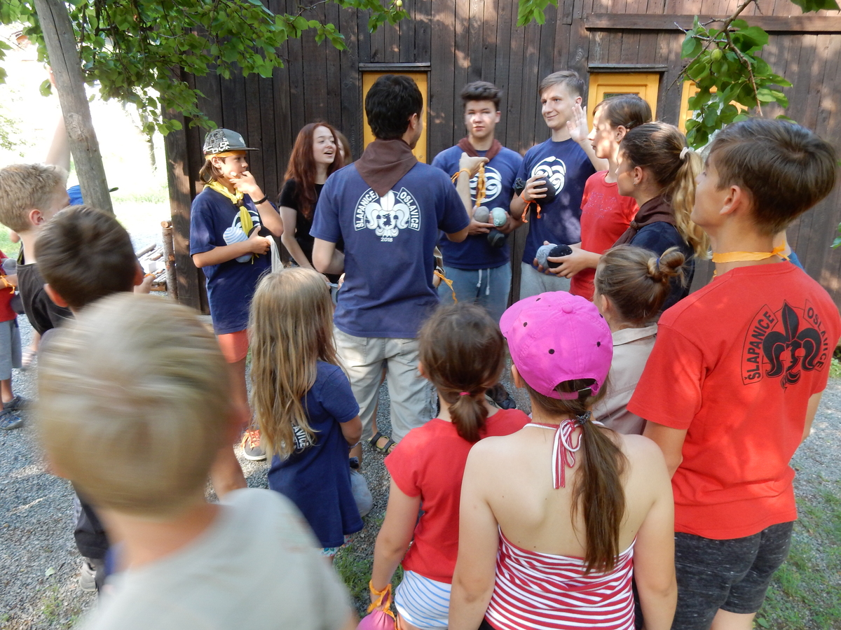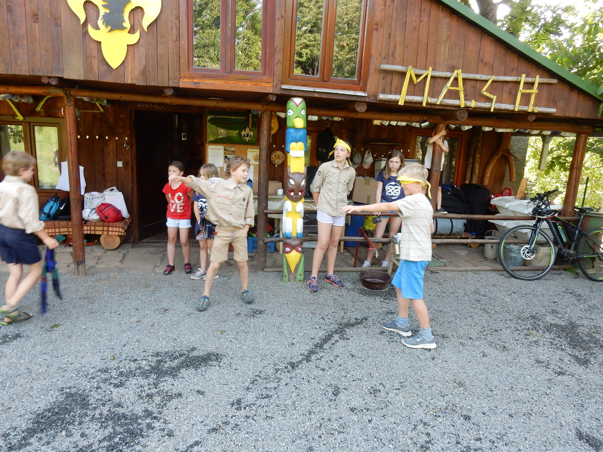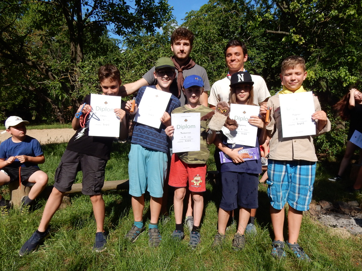 Je pátek 21.6.2019, 15:45, první letní den. Teploty atakují 30°C, svítí sluníčko a na Boudě se začínají scházet první členové oddílu. Sešlo se 48 dětí a 17 vedoucích.Po nástupu se děcka rozdělily na 2 poloviny a vysvětlily se pravidla hry Letadlo v mlze. Jde o hru, kde se v každém týmu děti rozdělí do dvojic, střelec se zavázanýma očima a navigátor. Po rozeznění píšťalky letí letadla do boje… Voda lítala vzduchem jako upřené pohledy střelců. Po dohrání se všichni sešli na špalcích a začalo vyhodnocování bodování a účasti. Jmen bylo řečeno během 10 minut opravdu hodně… Děti odcházely s odměnami jako jsou třeba plyšáci, čelovky, hrníčky, atd. Následovalo vyhodnocení otázek ze soutěže Vyznáte se?. Po vyhodnocení hned následovala tradiční bojovka s hadrovými koulemi. Stejné týmy, avšak s posilama z řad vedoucích. Bitva to byla neskutečná, koule lítaly vzduchem jedna za druhou. Zvednuté ruce a smutné odcházení na špalek… Po 3 kolech se rozhodlo vítězstvím 2:1 pro zelený. Teď už není moc o čem psát protože proběhl závěrečný nástup a šlo se domů. Tak se snad všichni zase brzo potkáme na táboře! Roxy