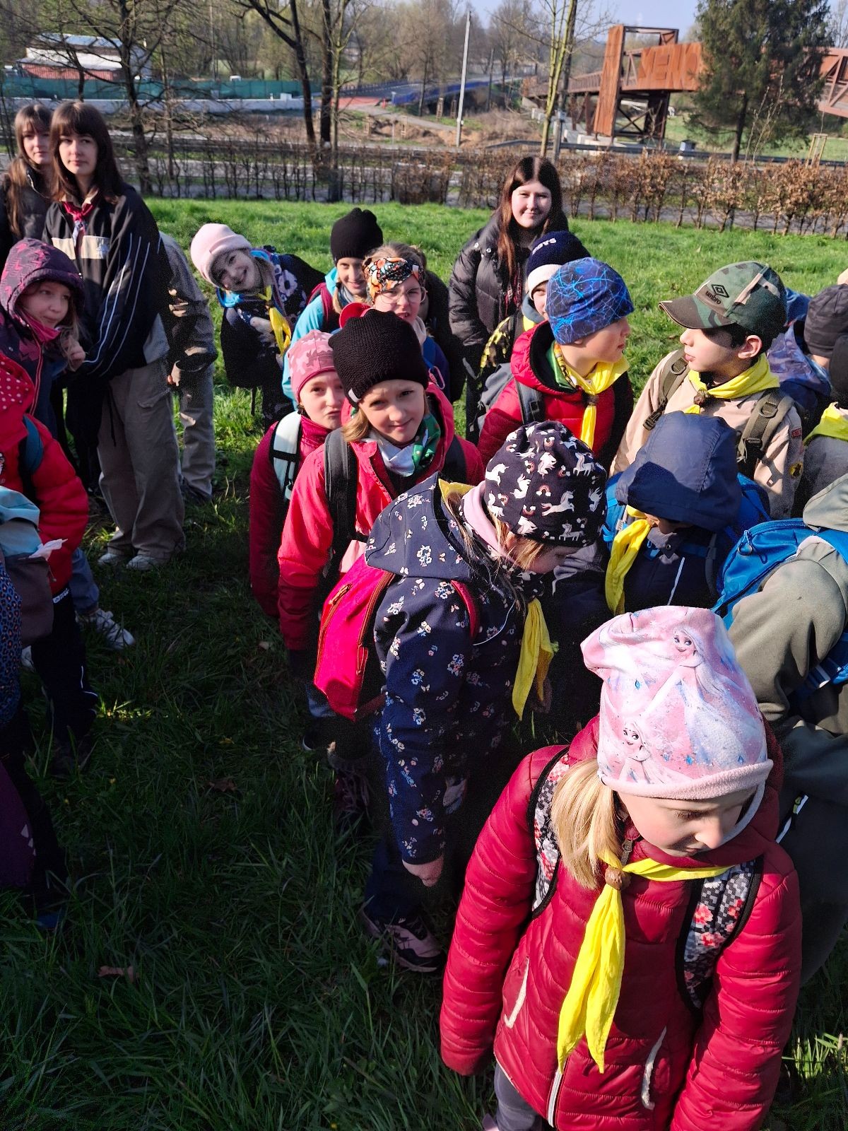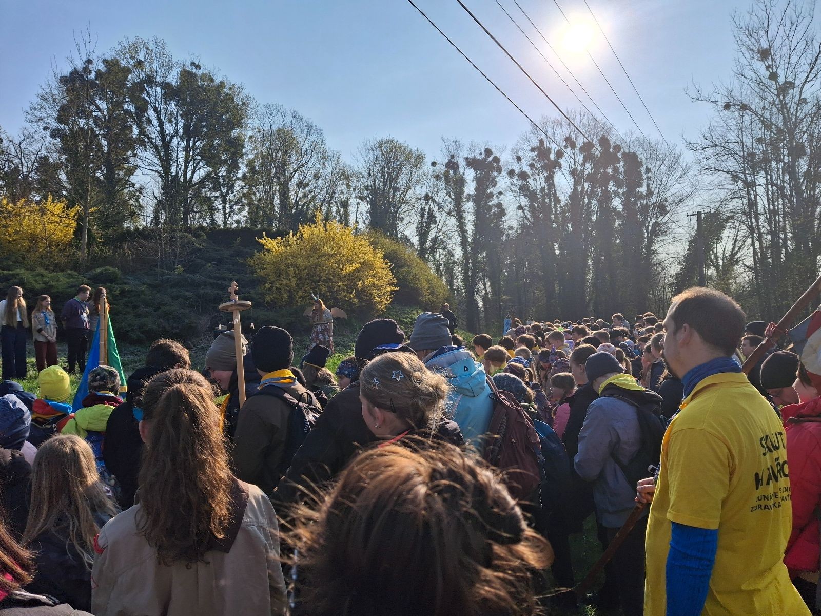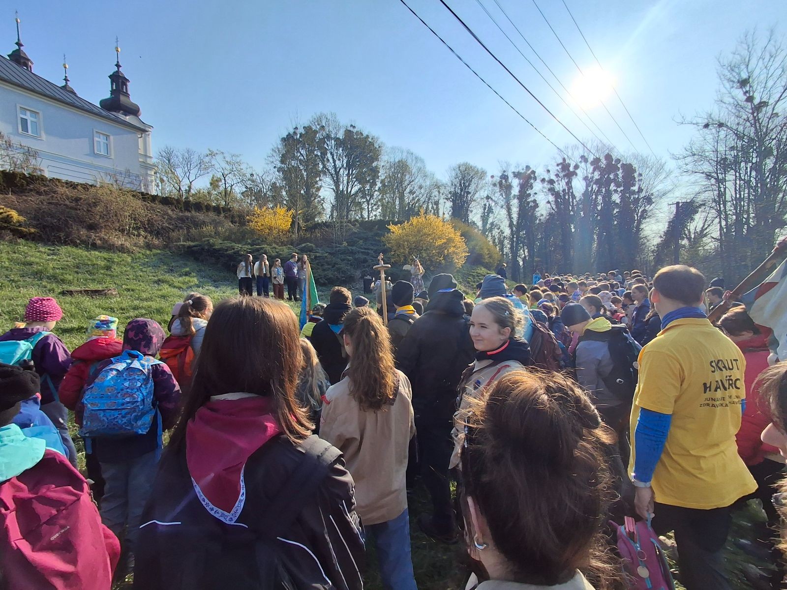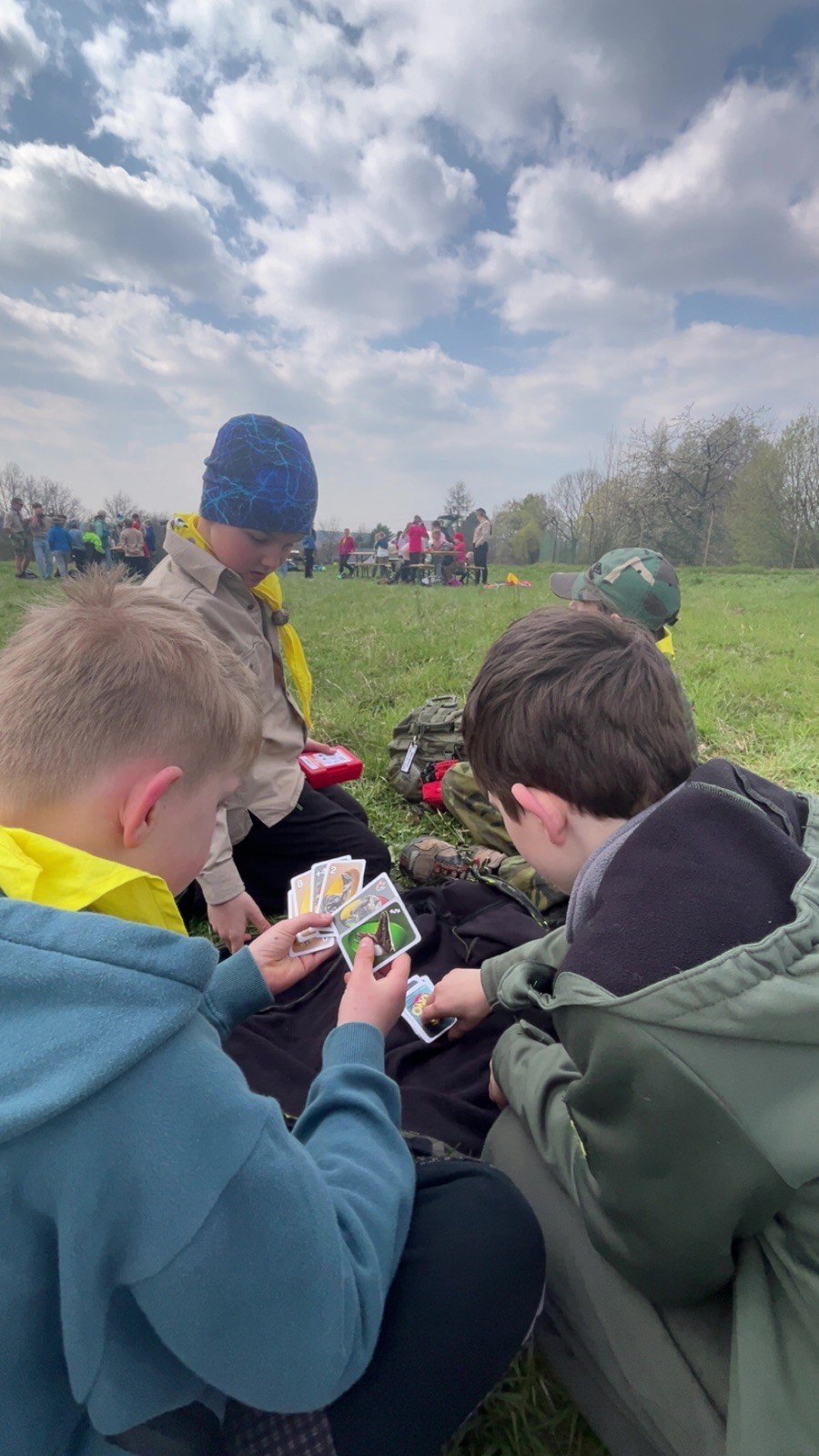 Místo činu jsme okamžitě poznali podle hromad hemžících se dětí ve skautských krojích a žlutých šátcích. Hnedka u registrace jsme prošli křížovým výslechem, jak je možné, že se středisko z Br*a účastní závodů v okrese Frýdek-Místek. No, a tento složitý příběh, o tom jak už se Uzlovi ve Šlapanicích nelíbilo a přišlo mu jako supr nápad vytvořit skaut na Hukvaldech, jsme pak vyprávěli ještě snad na každém stanovišti. Bohužel se s tím pojí i to, že se z nás staly nesoutěžní týmy, protože nepatříme do Moravskoslezského kraje a nemohli bychom postoupit do krajského kola. Nicméně tato skutečnost nás nijak neodradila od toho, si závod naplno užít a dát do toho vše!