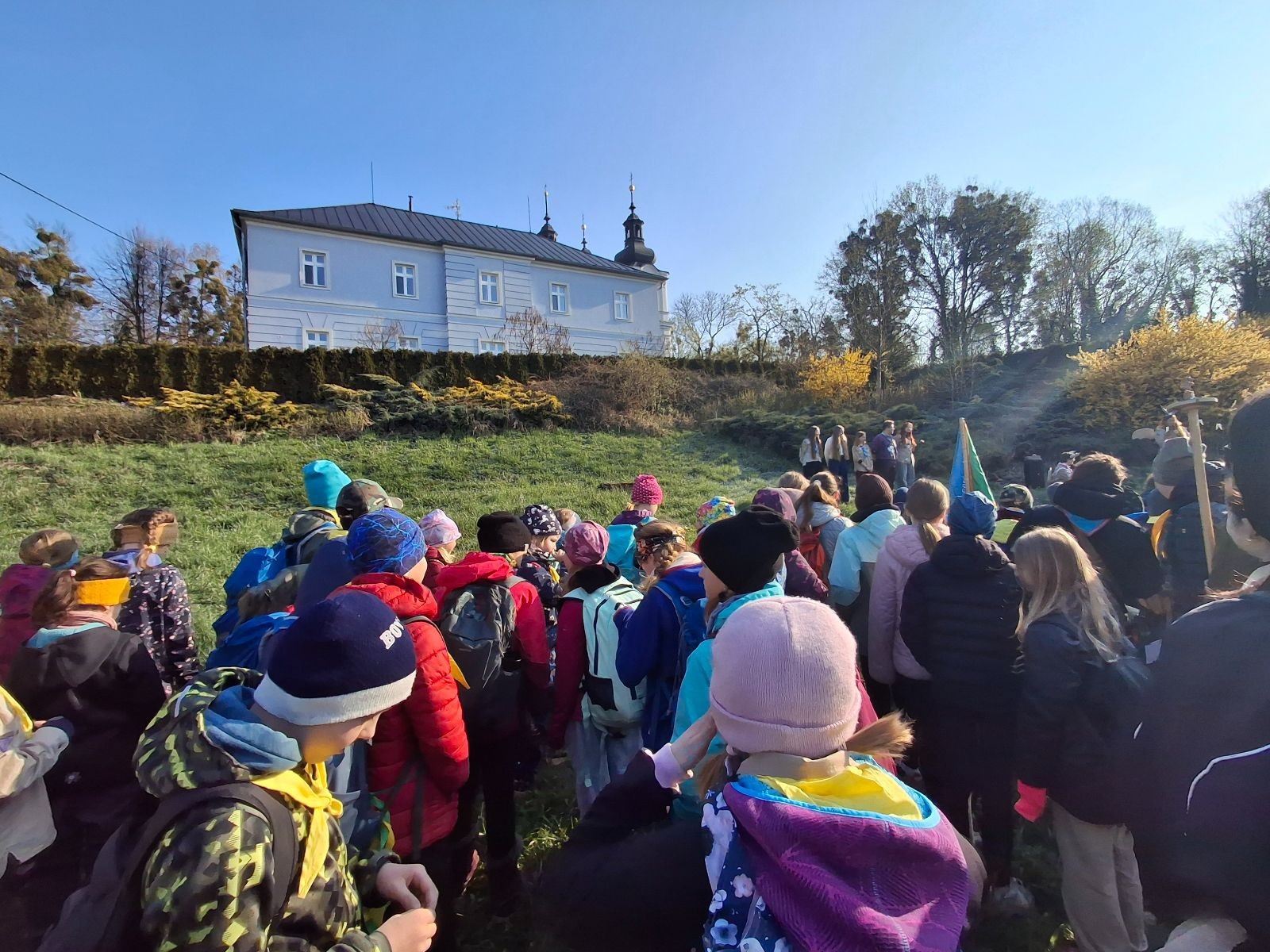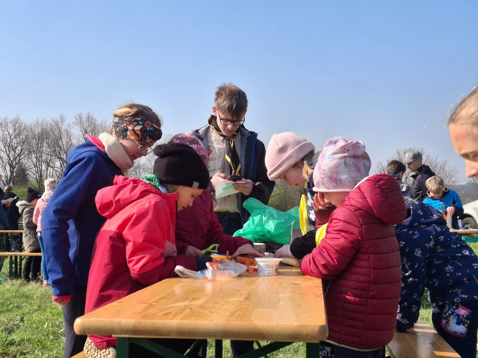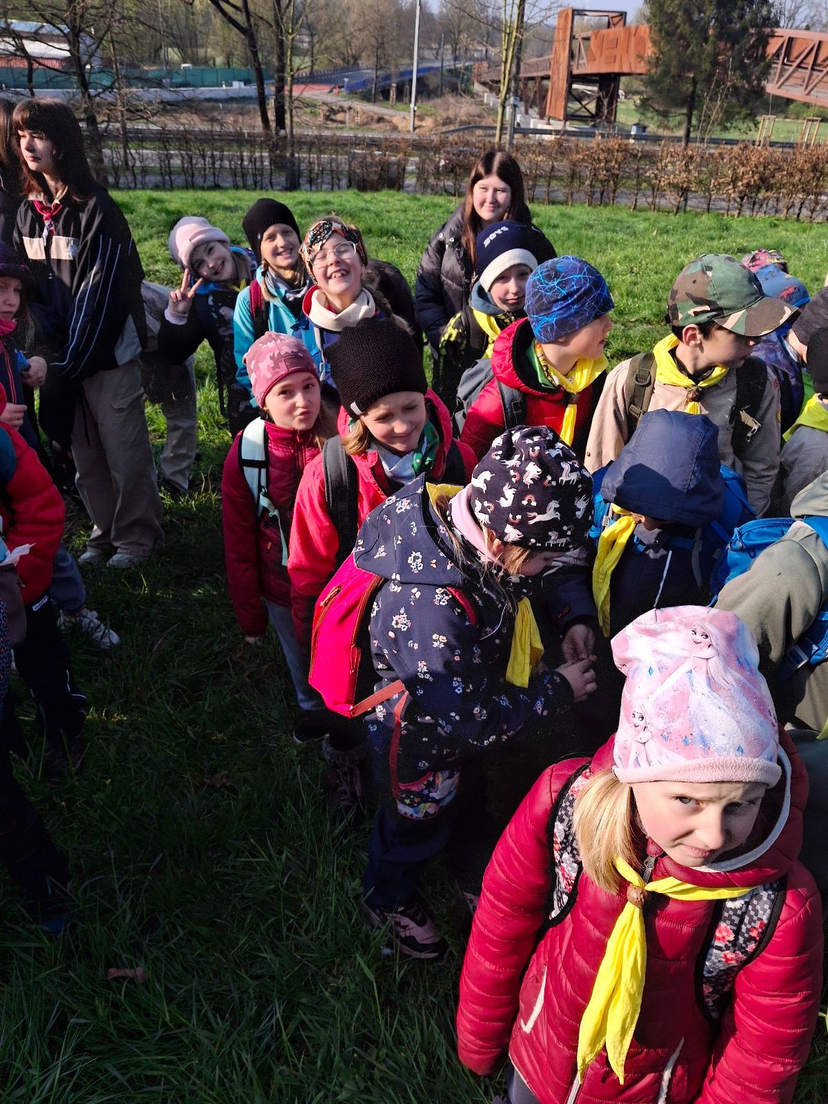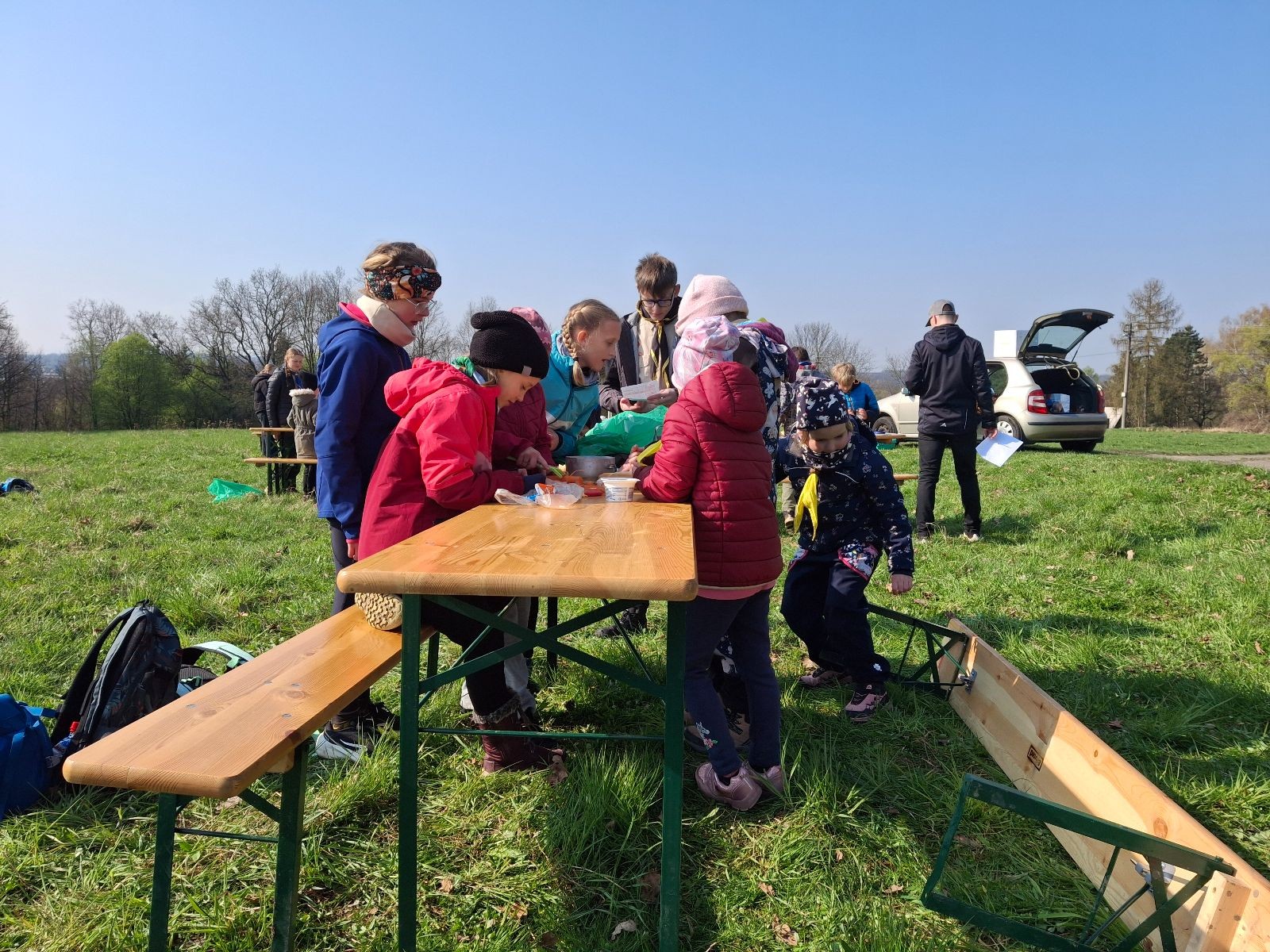 Místo činu jsme okamžitě poznali podle hromad hemžících se dětí ve skautských krojích a žlutých šátcích. Hnedka u registrace jsme prošli křížovým výslechem, jak je možné, že se středisko z Br*a účastní závodů v okrese Frýdek-Místek. No, a tento složitý příběh, o tom jak už se Uzlovi ve Šlapanicích nelíbilo a přišlo mu jako supr nápad vytvořit skaut na Hukvaldech, jsme pak vyprávěli ještě snad na každém stanovišti. Bohužel se s tím pojí i to, že se z nás staly nesoutěžní týmy, protože nepatříme do Moravskoslezského kraje a nemohli bychom postoupit do krajského kola. Nicméně tato skutečnost nás nijak neodradila od toho, si závod naplno užít a dát do toho vše!