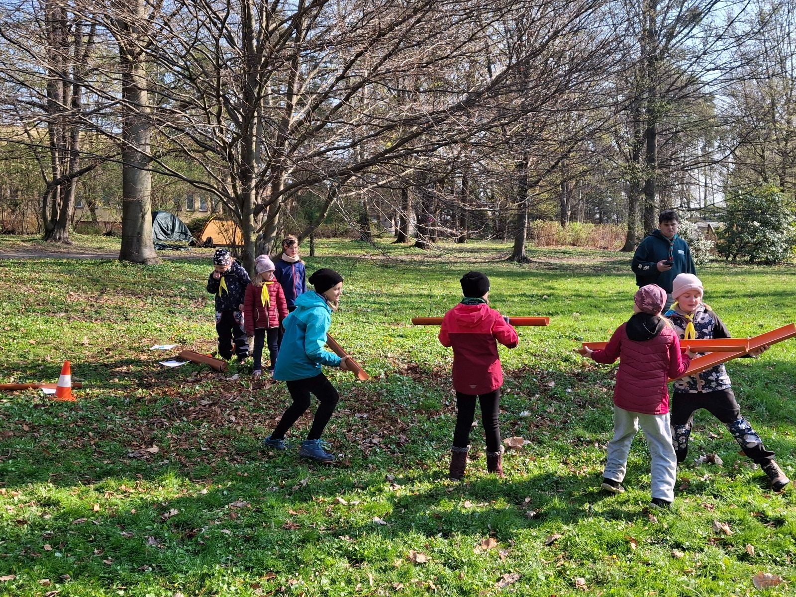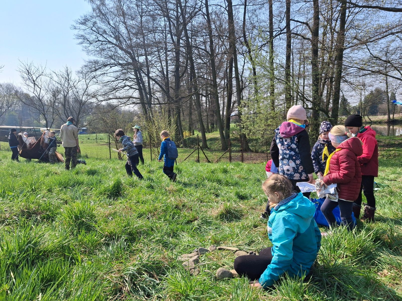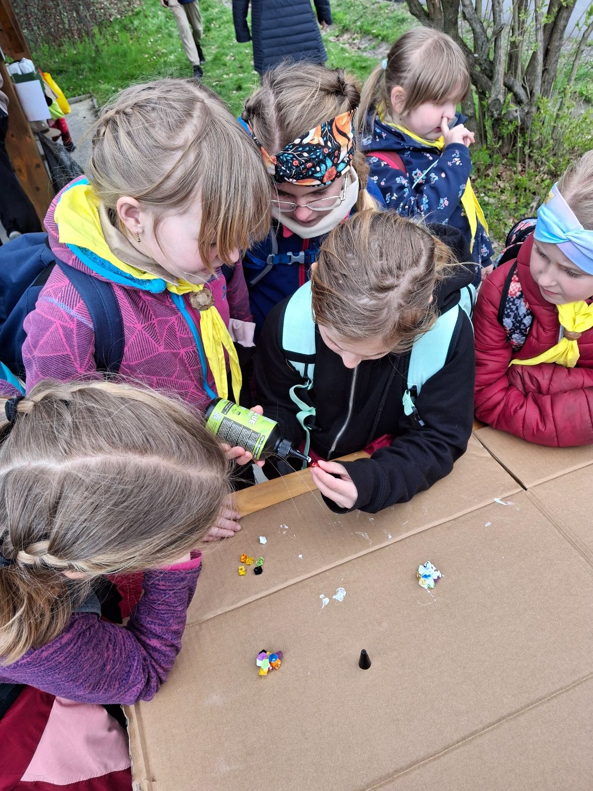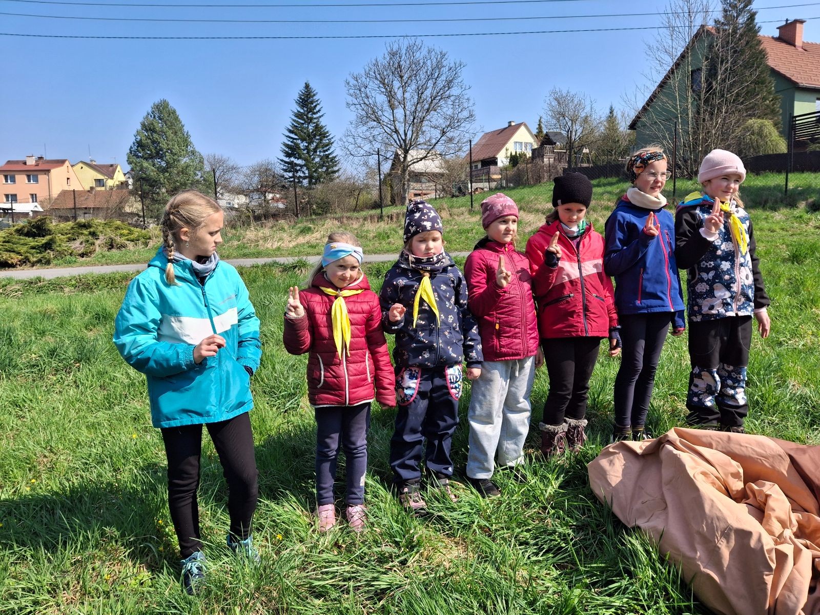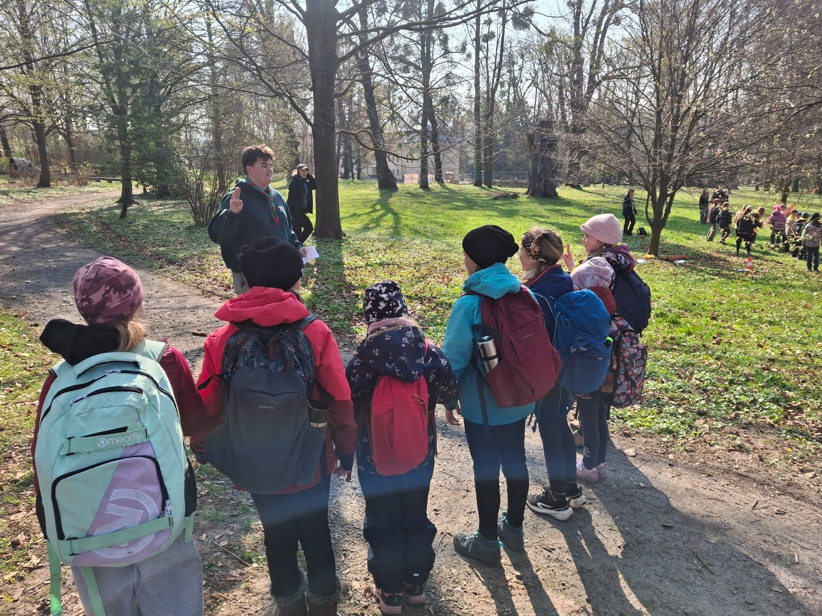 Místo činu jsme okamžitě poznali podle hromad hemžících se dětí ve skautských krojích a žlutých šátcích. Hnedka u registrace jsme prošli křížovým výslechem, jak je možné, že se středisko z Br*a účastní závodů v okrese Frýdek-Místek. No, a tento složitý příběh, o tom jak už se Uzlovi ve Šlapanicích nelíbilo a přišlo mu jako supr nápad vytvořit skaut na Hukvaldech, jsme pak vyprávěli ještě snad na každém stanovišti. Bohužel se s tím pojí i to, že se z nás staly nesoutěžní týmy, protože nepatříme do Moravskoslezského kraje a nemohli bychom postoupit do krajského kola. Nicméně tato skutečnost nás nijak neodradila od toho, si závod naplno užít a dát do toho vše!