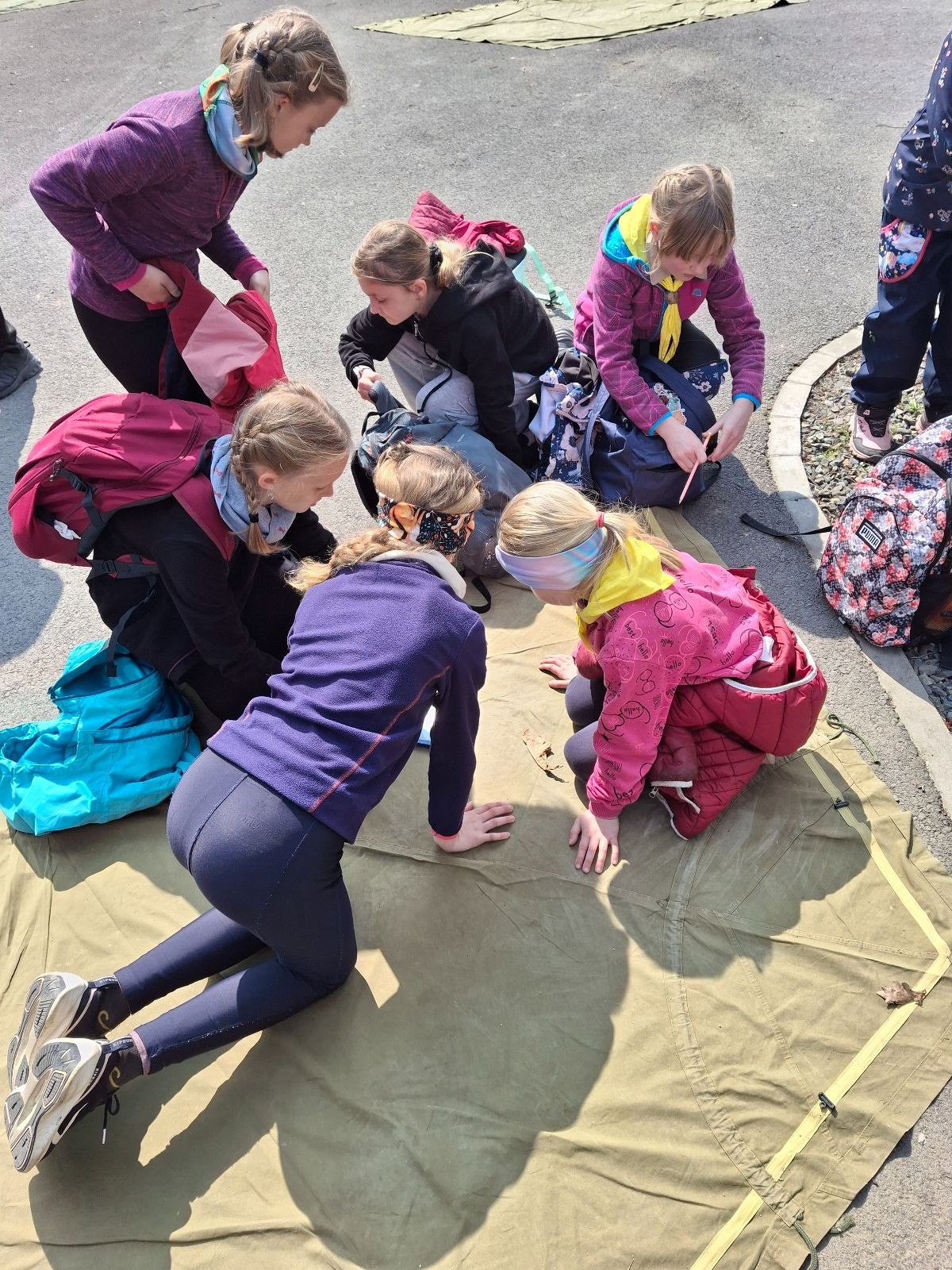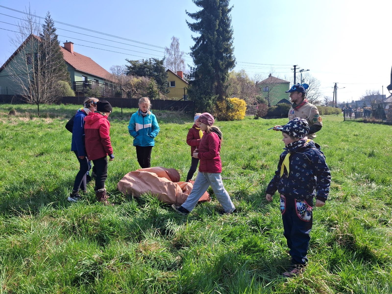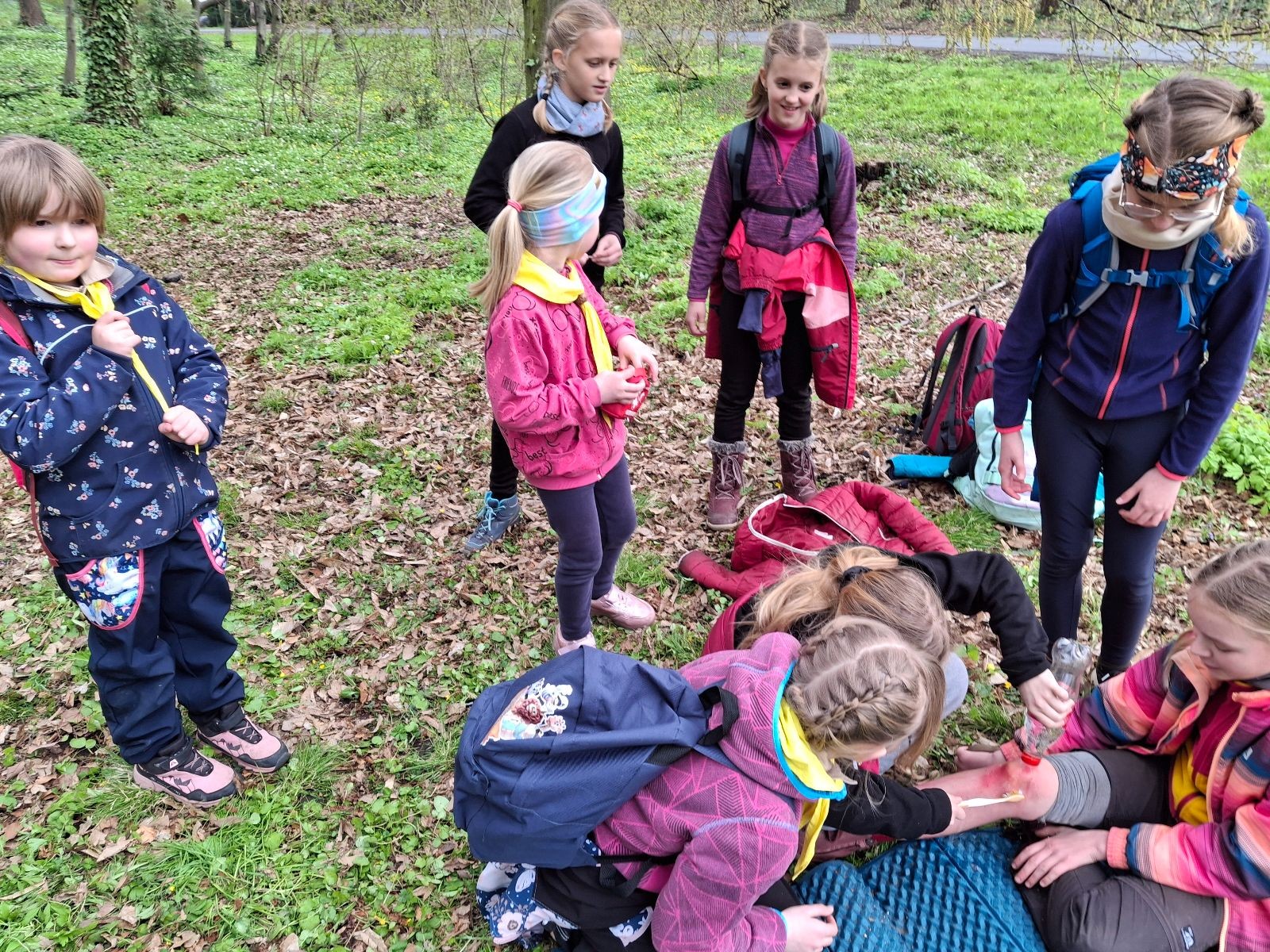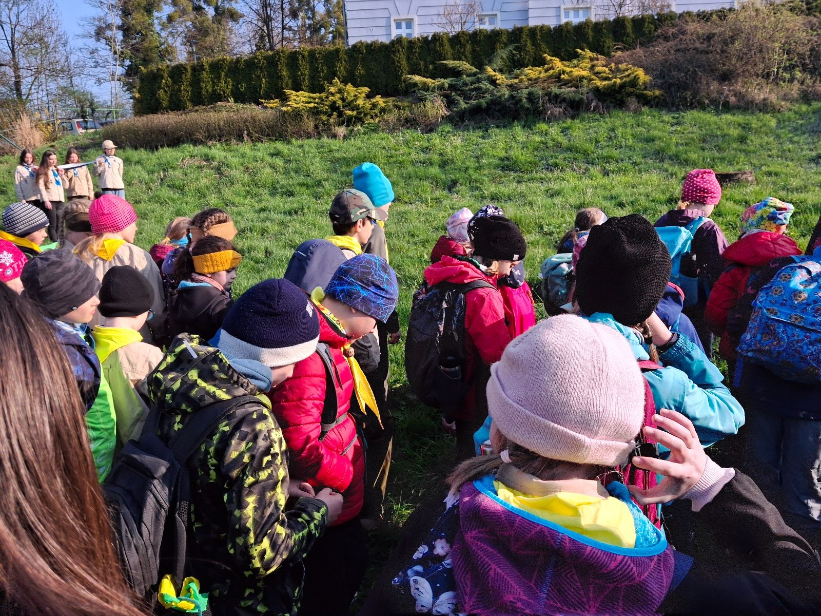 Místo činu jsme okamžitě poznali podle hromad hemžících se dětí ve skautských krojích a žlutých šátcích. Hnedka u registrace jsme prošli křížovým výslechem, jak je možné, že se středisko z Br*a účastní závodů v okrese Frýdek-Místek. No, a tento složitý příběh, o tom jak už se Uzlovi ve Šlapanicích nelíbilo a přišlo mu jako supr nápad vytvořit skaut na Hukvaldech, jsme pak vyprávěli ještě snad na každém stanovišti. Bohužel se s tím pojí i to, že se z nás staly nesoutěžní týmy, protože nepatříme do Moravskoslezského kraje a nemohli bychom postoupit do krajského kola. Nicméně tato skutečnost nás nijak neodradila od toho, si závod naplno užít a dát do toho vše!