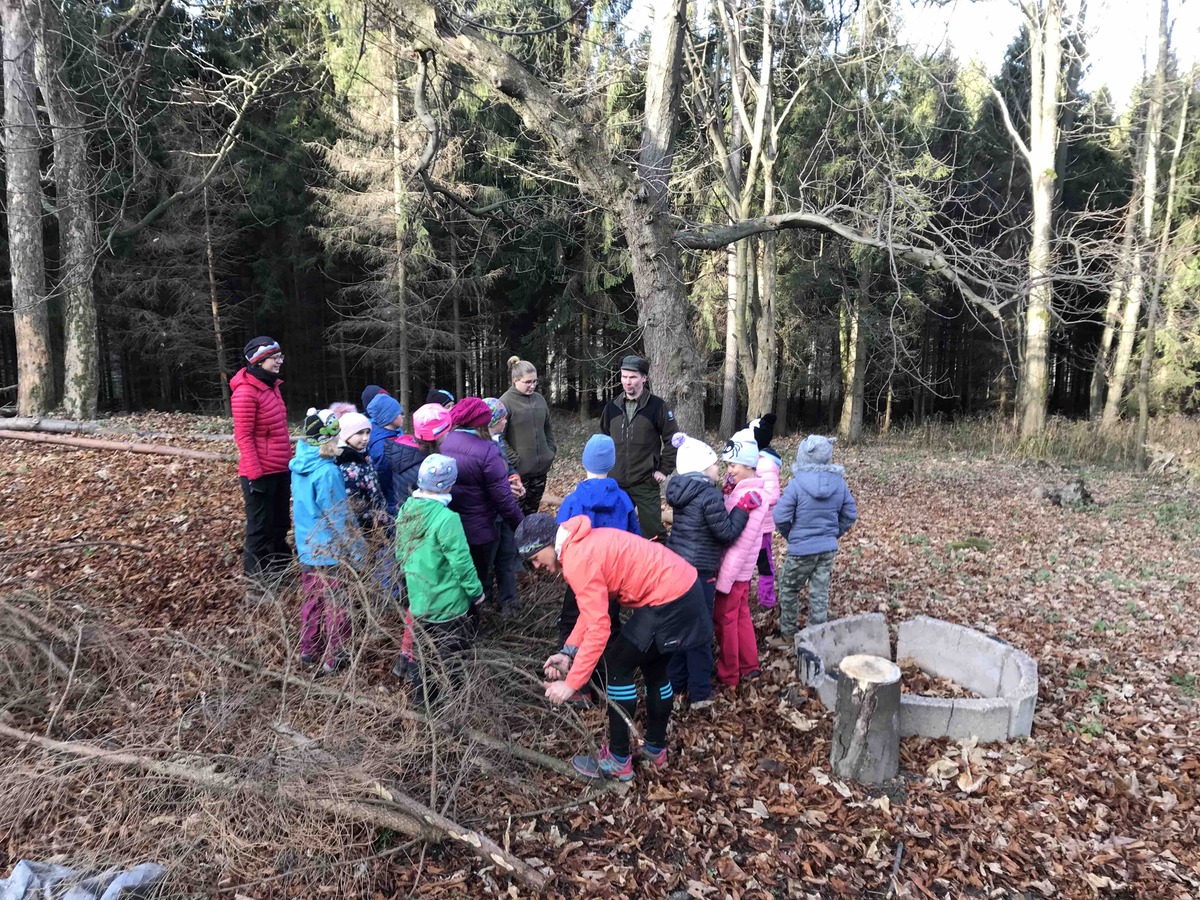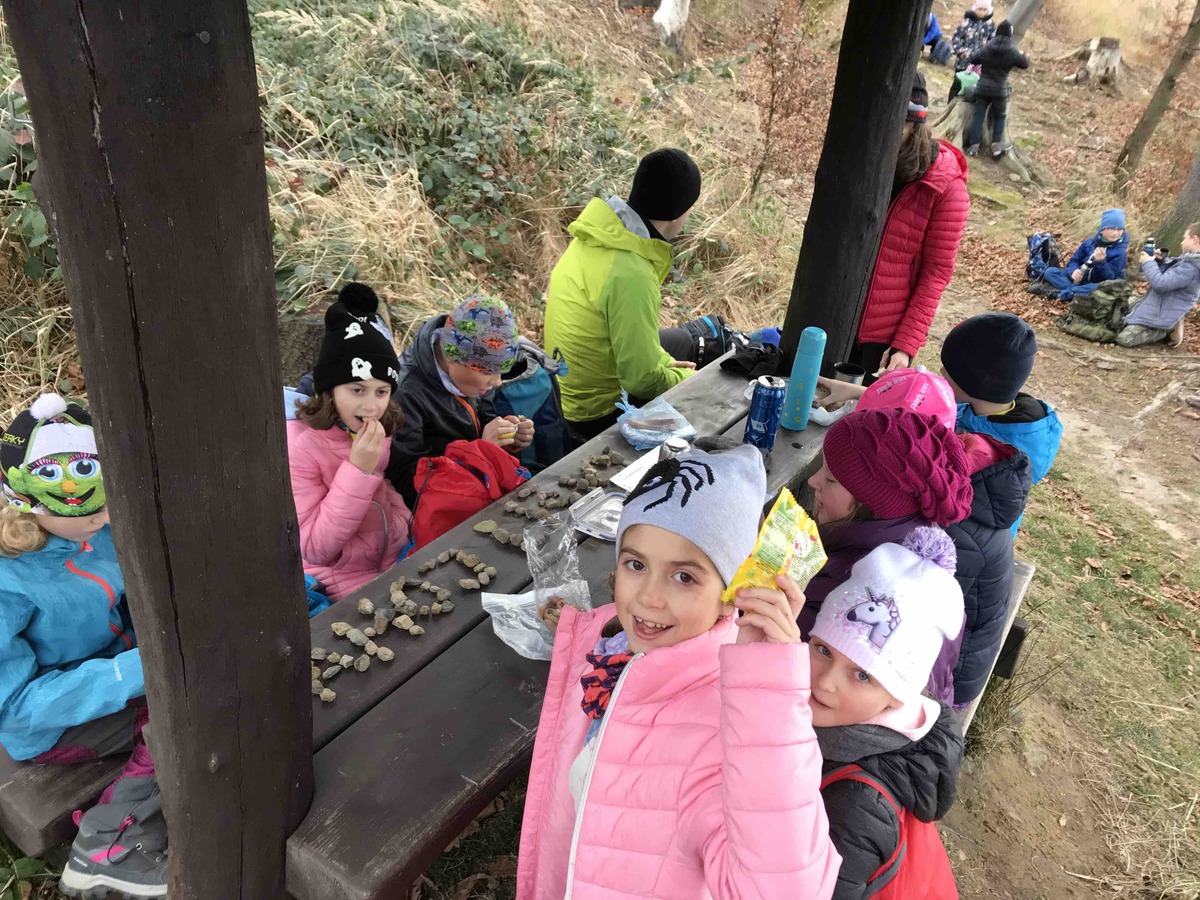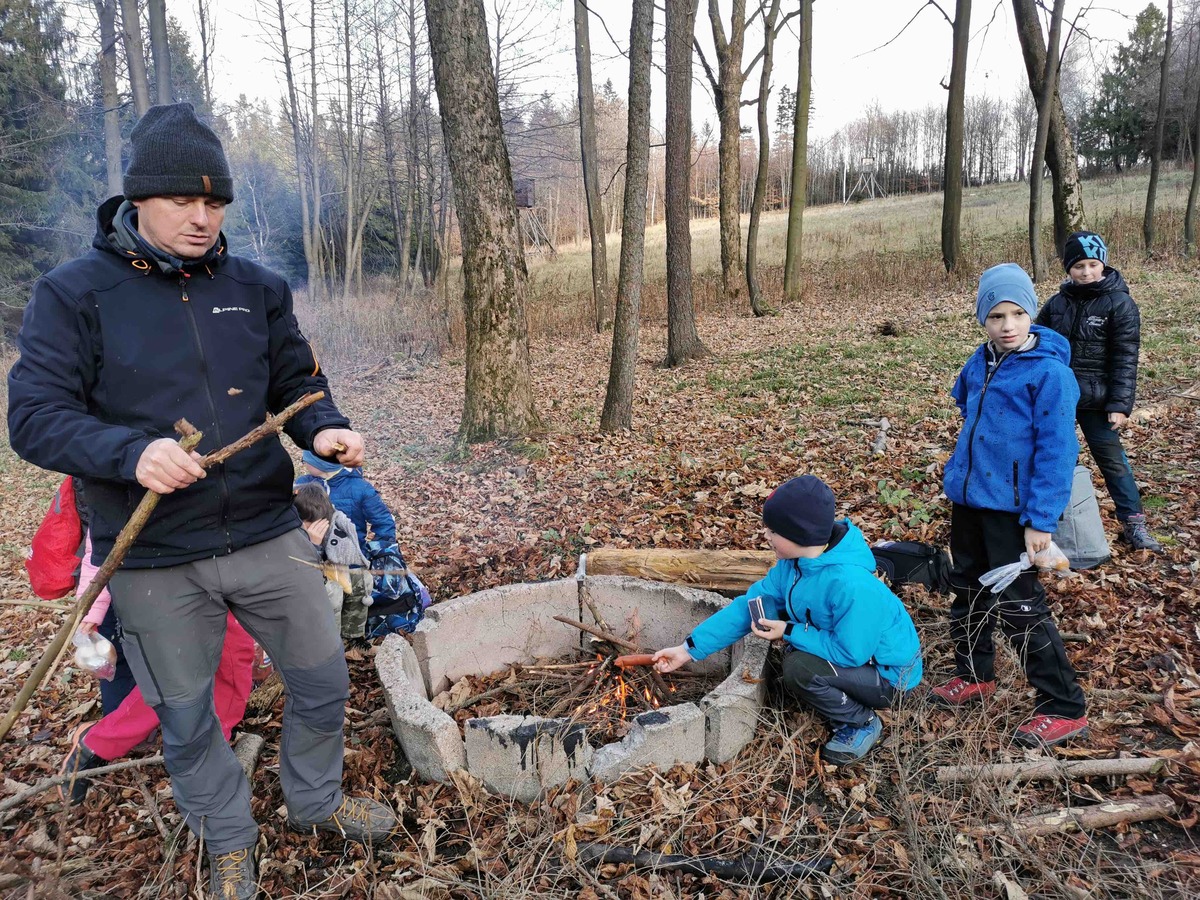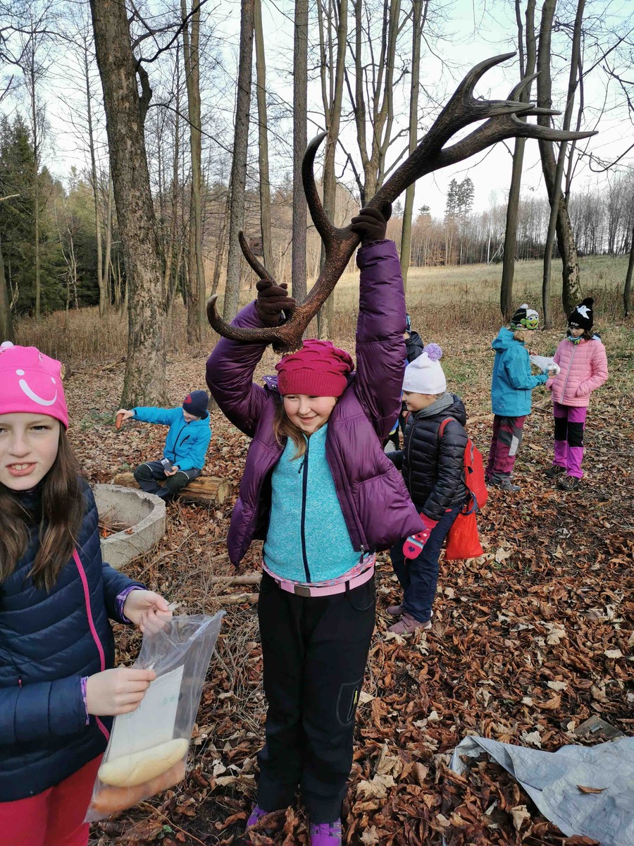 Dnes se Lišky vydaly na Hůrky hledat tajemné místo, které měly zaznačené na mapě. V 9 jsme se sešli u Myslivecké chaty. Děti dostaly úkoly, co mají cestou najít, a mapu. Trošku jsme si ukázali orientaci s mapou a pak už se děti ujaly vedení a nejkratší cestou nás tam zavedly. Na místě nás čekal pan lesník, který pro nás měl připraveno napínavé vyprávění o místní zvěři. Mohli jsme si potěžkat, co na hlavě nosí jelen, daněk i muflon nebo osahat zuby divočáka. Potom děti měly za úkol najít v lese odložená paroží a posléze vystopovat lišku a 3 hody se ji snažit zasáhnout. Pak jsme si rozdělali oheň a opekli špekáčky, ať se posilníme na cestu zpět. Ta byla ve znamení dalších potop a bomb, ale i strefovaček a orientace s mapou. Mimo jiné jsme posbírali i několik rozbitých lahví, které jak jsme se dozvěděli, pro zvířata v lese představují smrtelné nebezpečí, když na ni šlápnou a poraní si nohu.