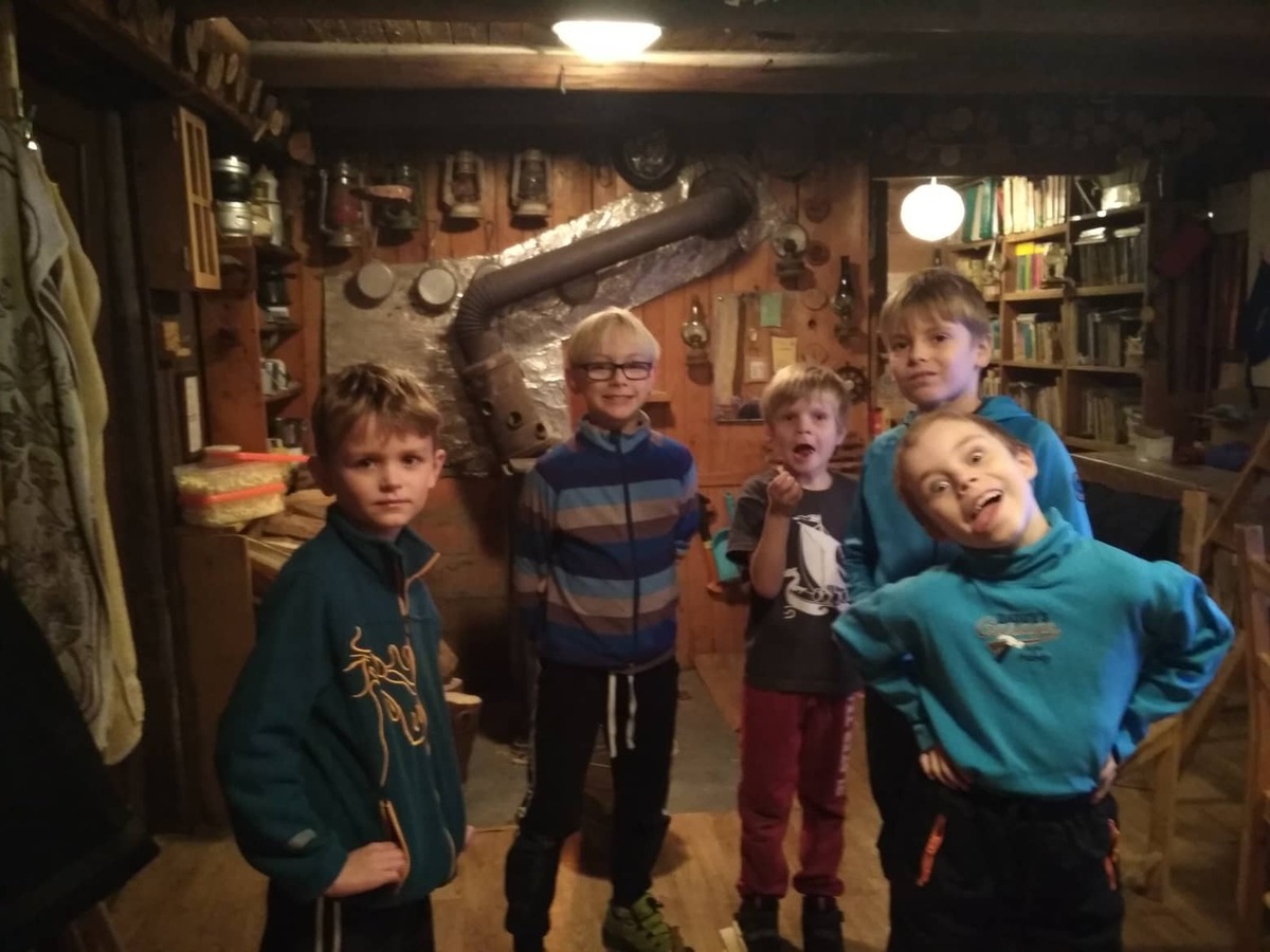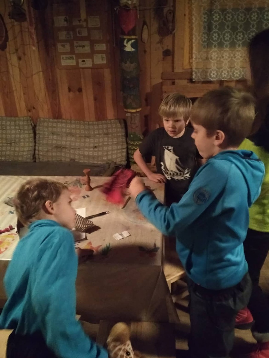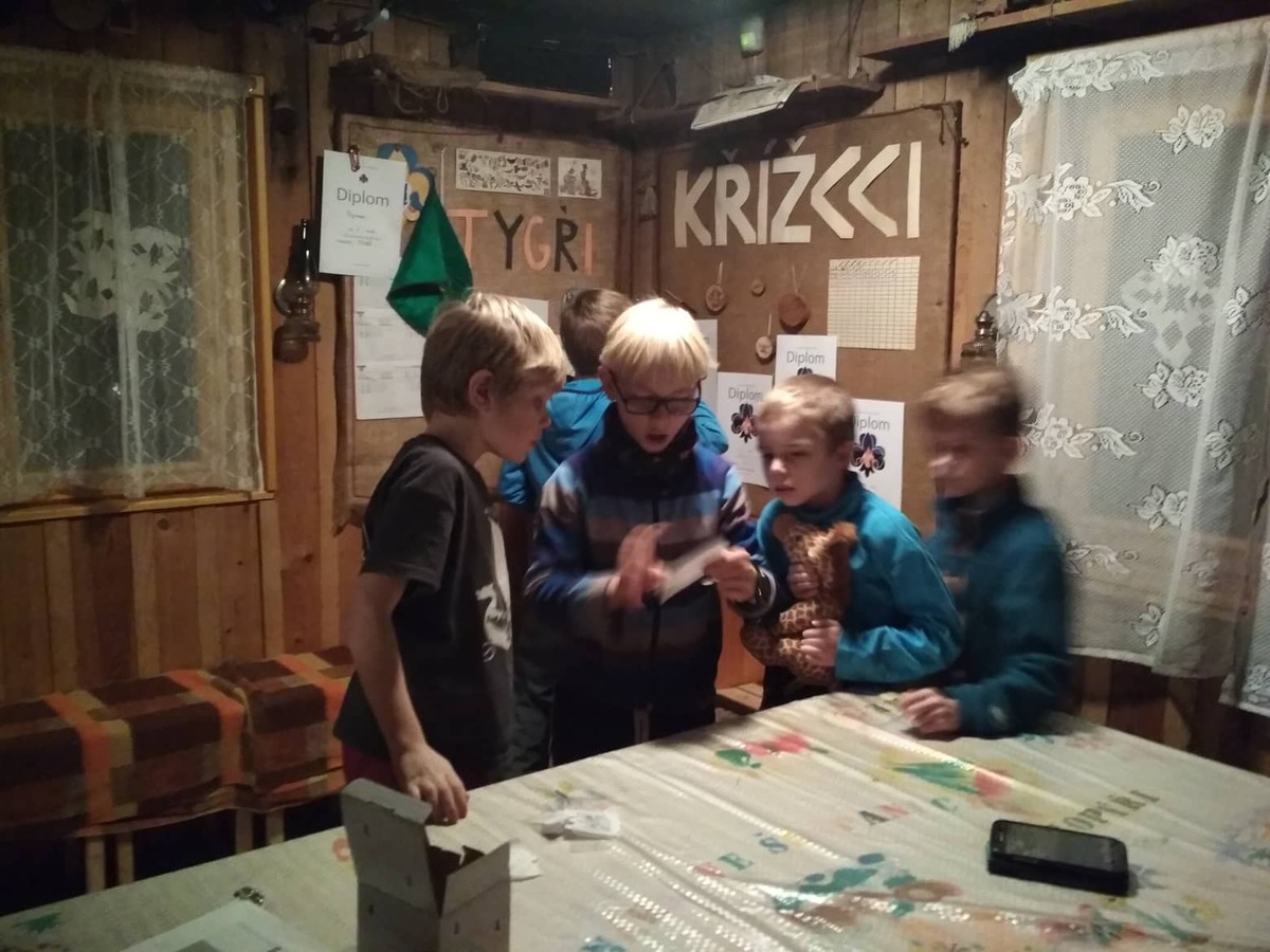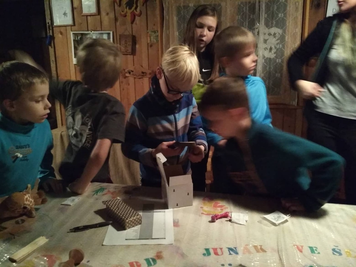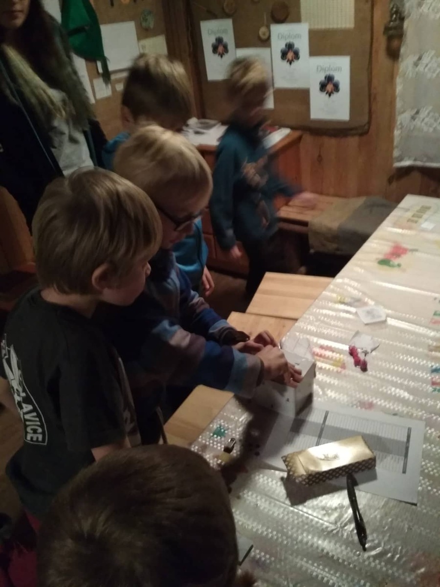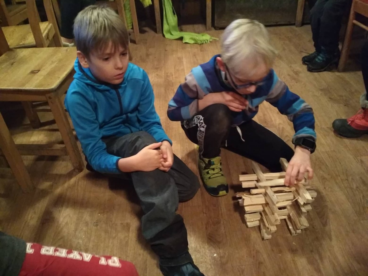 Na Boudě jsme se sešli 18. 1. 2020 kolem páté hodiny odpoledne. Kromě nás vedoucích a pěti žraloků – Danyho, Matyho, Davea, Honzy M. a Pepy – se k nám přidala i Lvíče z Veverek (sestra Honzy). Zahráli jsme si pár her na rozehřátí a zvládli jsme i jedno kolo městečka Palerma. Potom jsme se přesunuli do Staré Boudy, kde si pro nás duch válečného zběha Hanse Hagena připravil únikovou hru, kdy kluci za pomoci různých indicií schovaných po Boudě museli najít klíč ode dveří a dostat se ven. To samozřejmě zvládli úplně s přehledem. Potom, aby nám rychleji ubíhalo čekání na objednanou pizzu, jsme si venku zahráli dvě kola Haagena (schovka ve tmě) a potom si pustili pár dílů Pata a Mata.