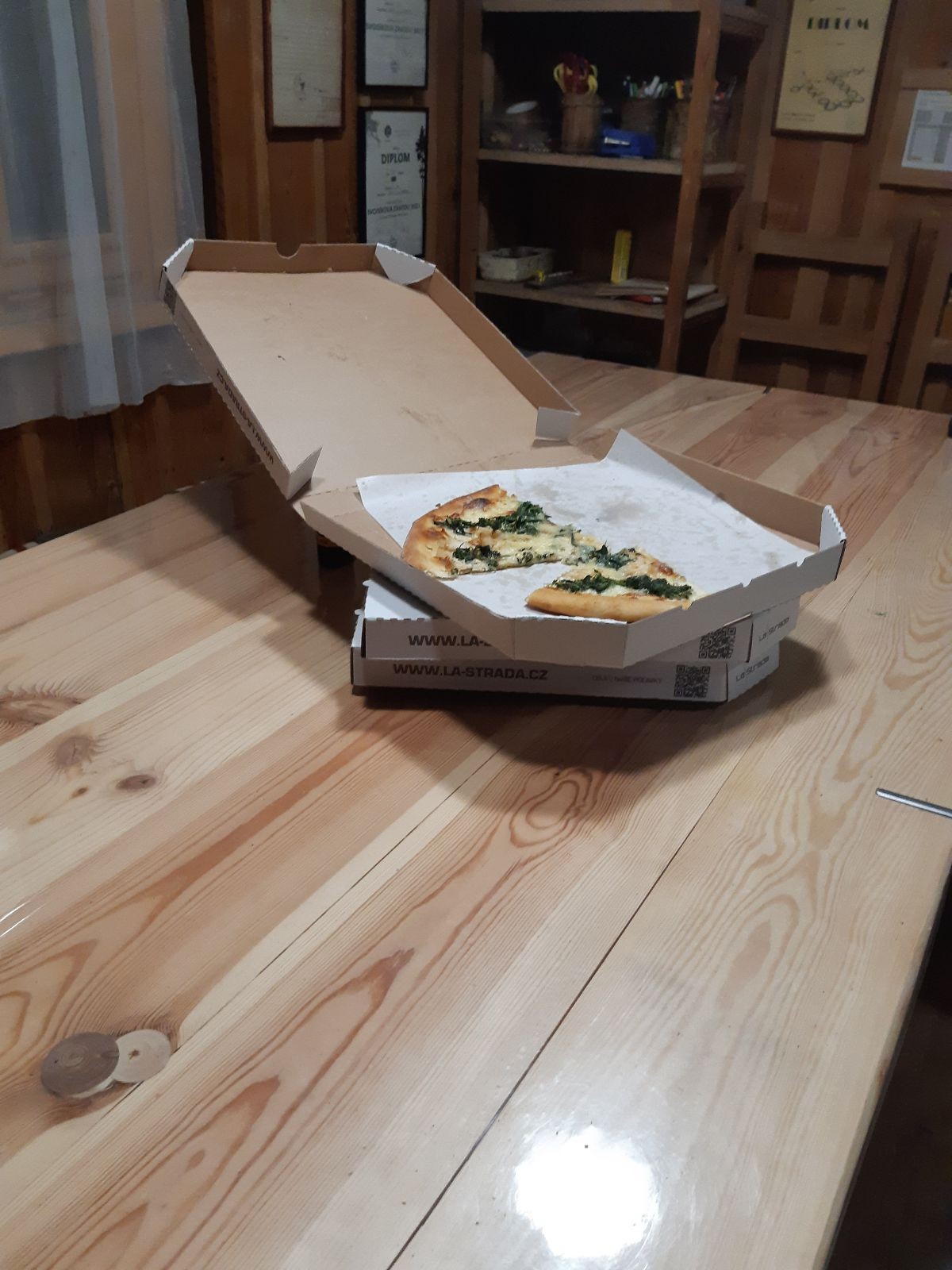 Okolo deváté nám dorazila pizza (ještě jednou moc děkujeme jedné milé mamince